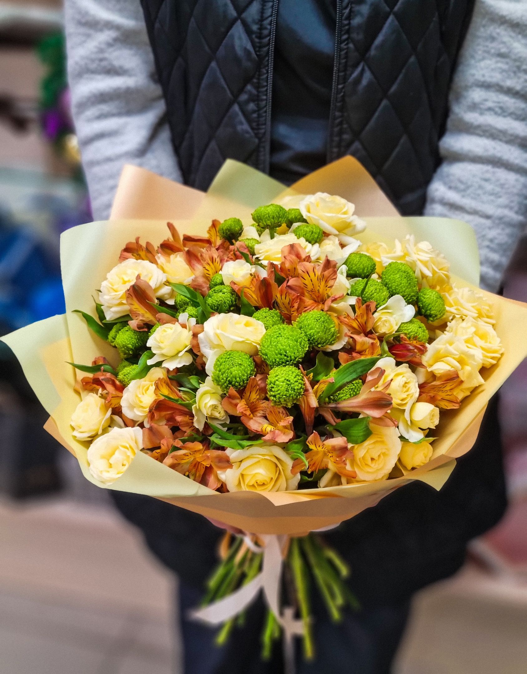 Букет из: кустовой хризантемы, роз, альстромерии, кустовой розы.
