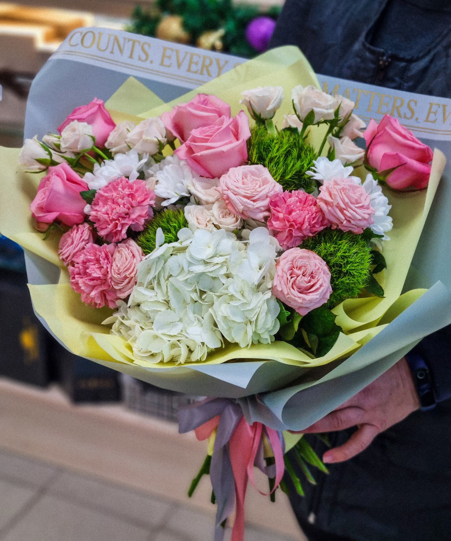 Букет из: роз, кустовой розы, гортензии, гвоздики, кустовой хризантемы.