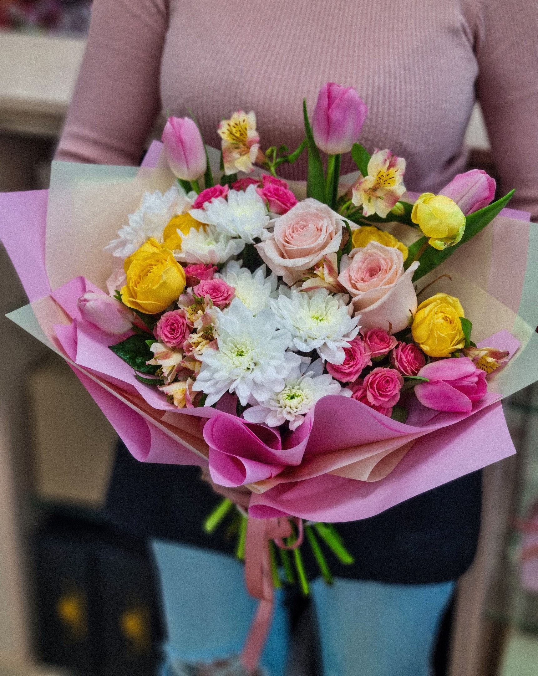 Букет из: кустовой хризантемы, тюльпанов, альстромерии, кустовой розы, роз.