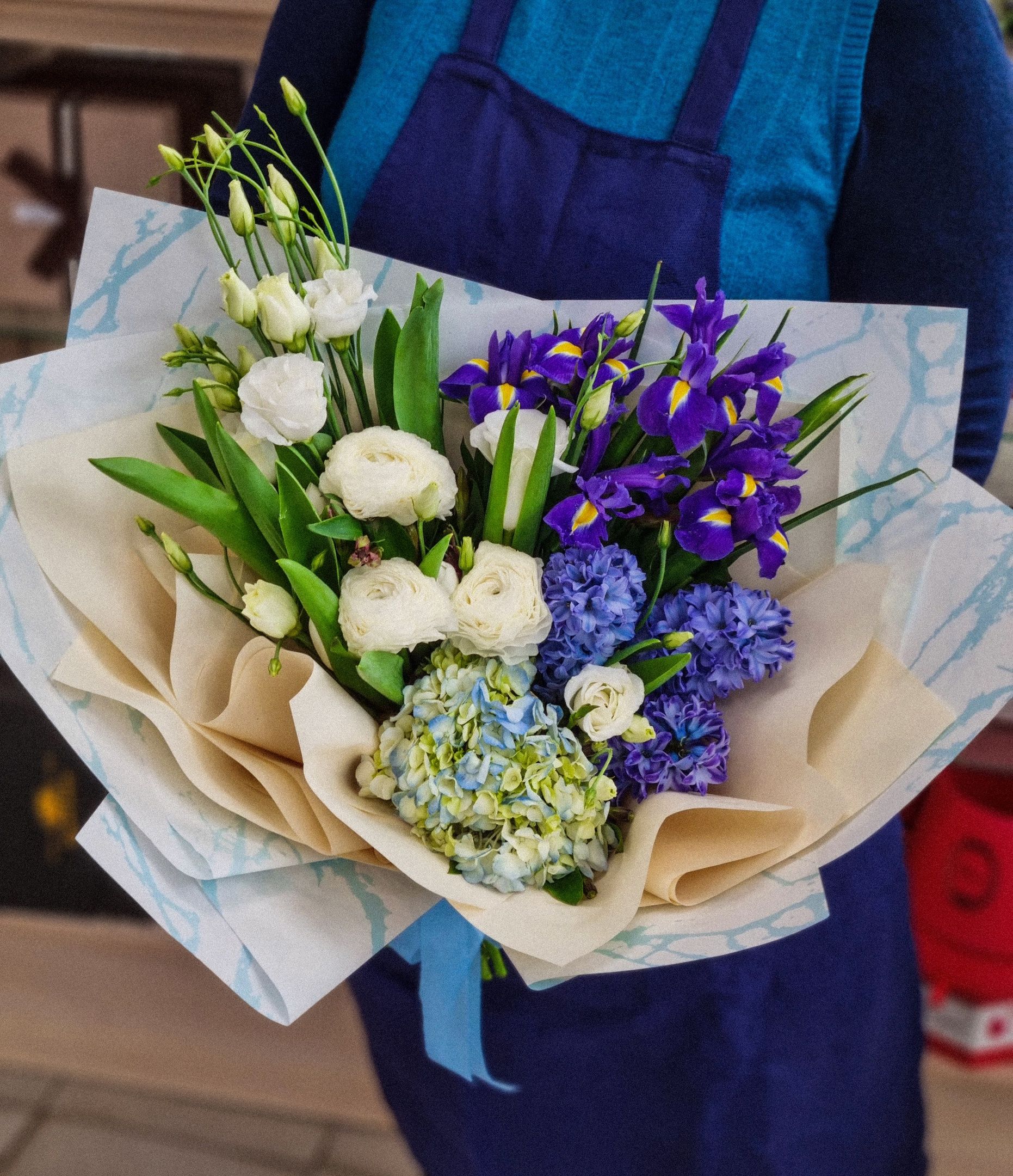 Букет из: ранункулюса, гортензии, ирис, эустомы.