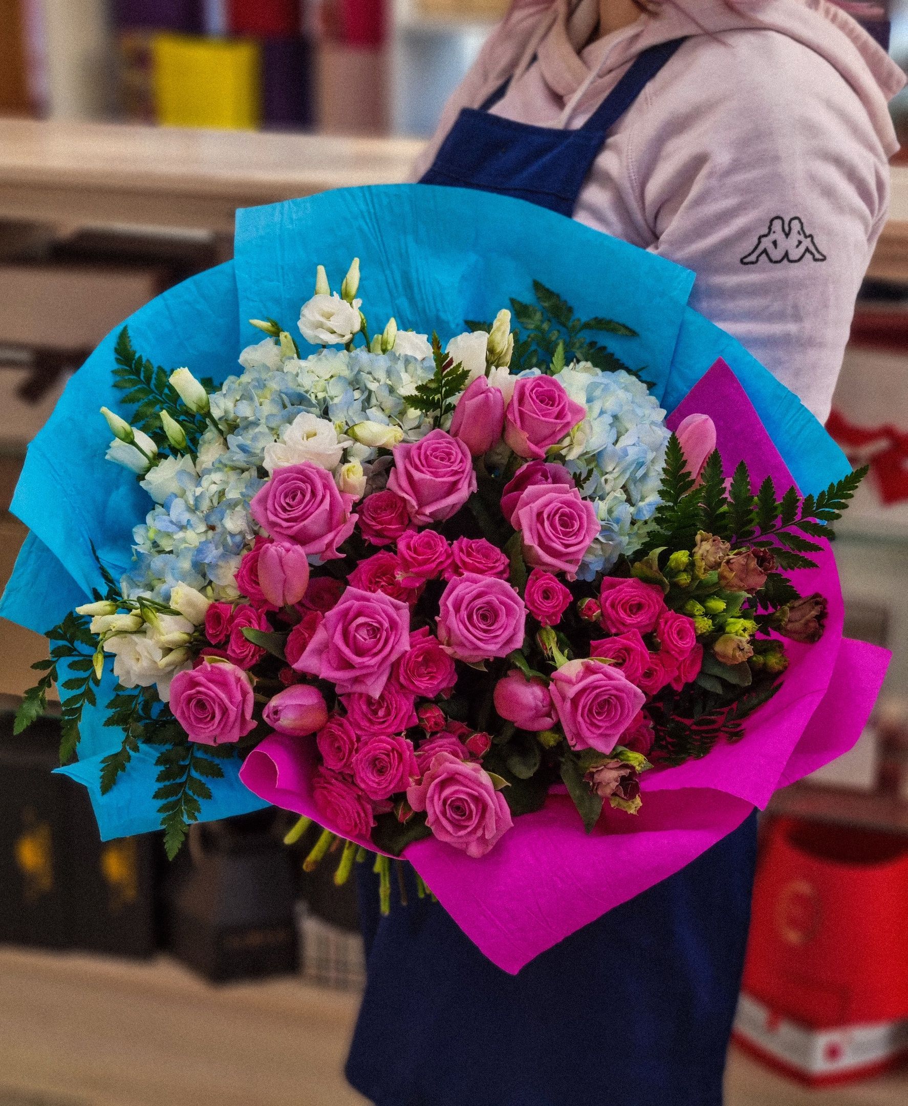 Букет из: роз, эустомы, кустовой розы, гортензии.