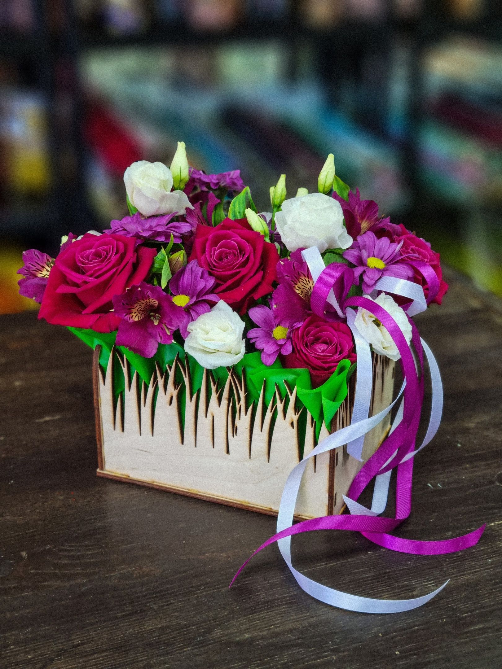 Композиция из: роз, альстромерии, кустовой хризантемы, эустомы.