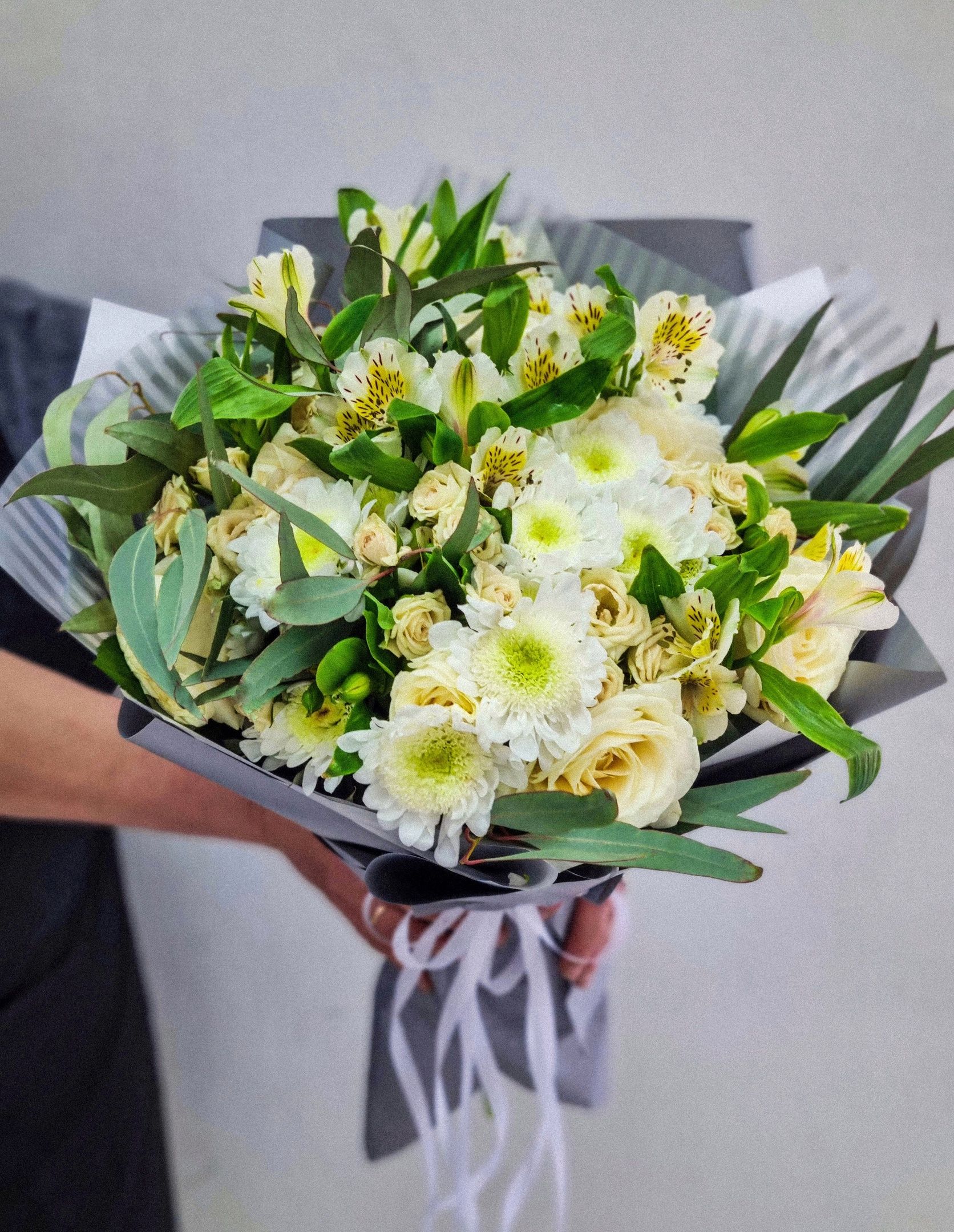 Букет из: кустовой хризантемы, розы, кустовой розы, альстромерии.