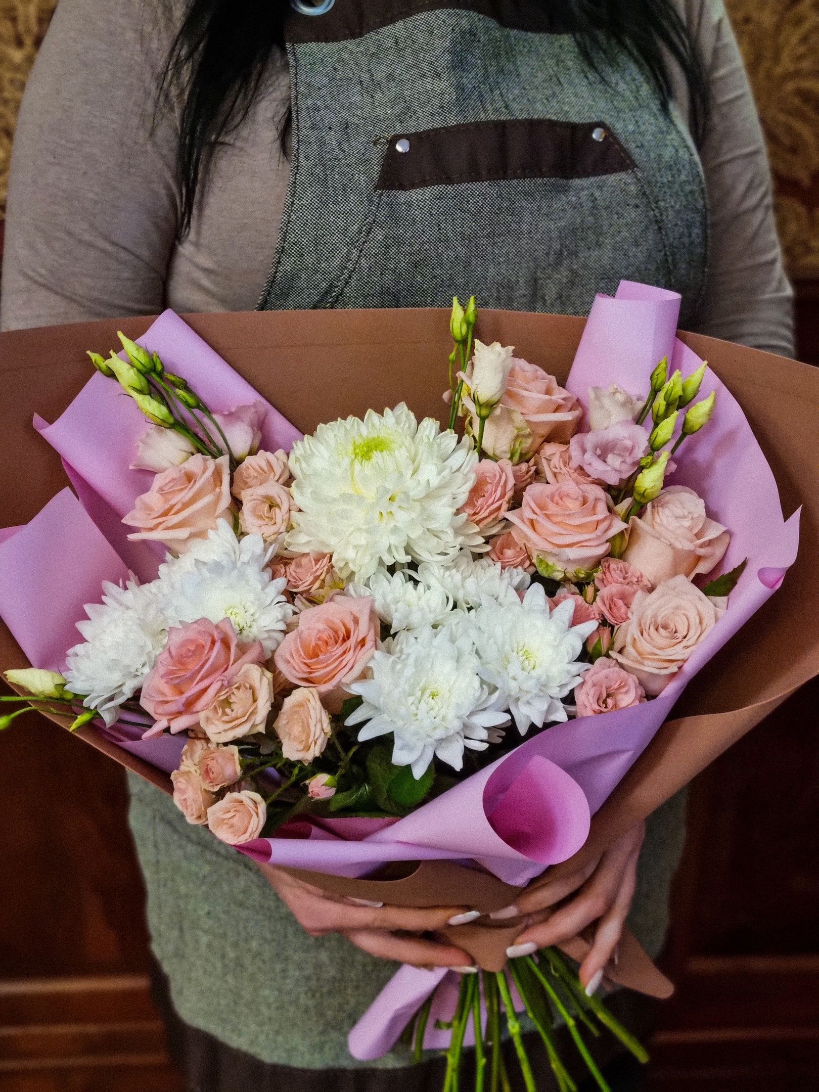 Букет из: кустовой розы, кустовой хризантемы, роз, одноголовой хризантемы, эустомы, альстромерии.
