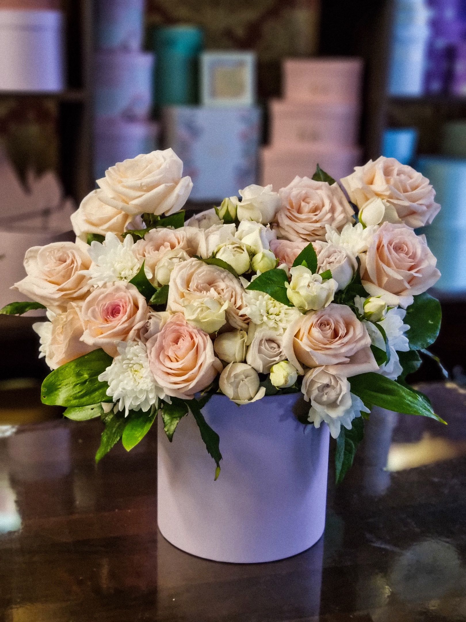 Композиция из: кустовой хризантемы, роз, кустовой розы.