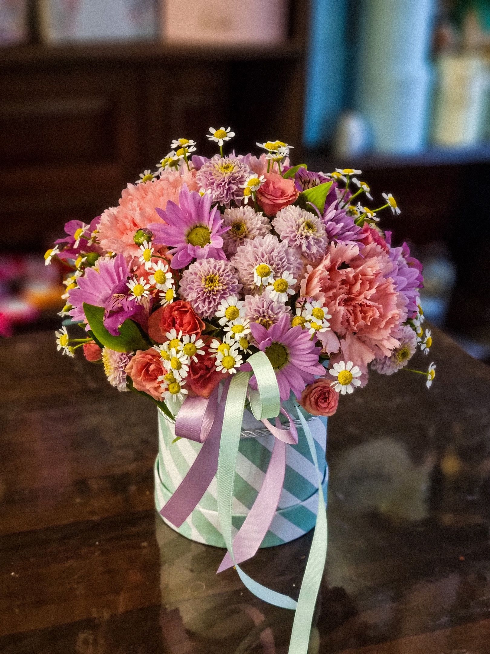 Композиция из: танацетума, сантини, кустовой хризантемы, гвоздики, кустовой розы, альстромерии.