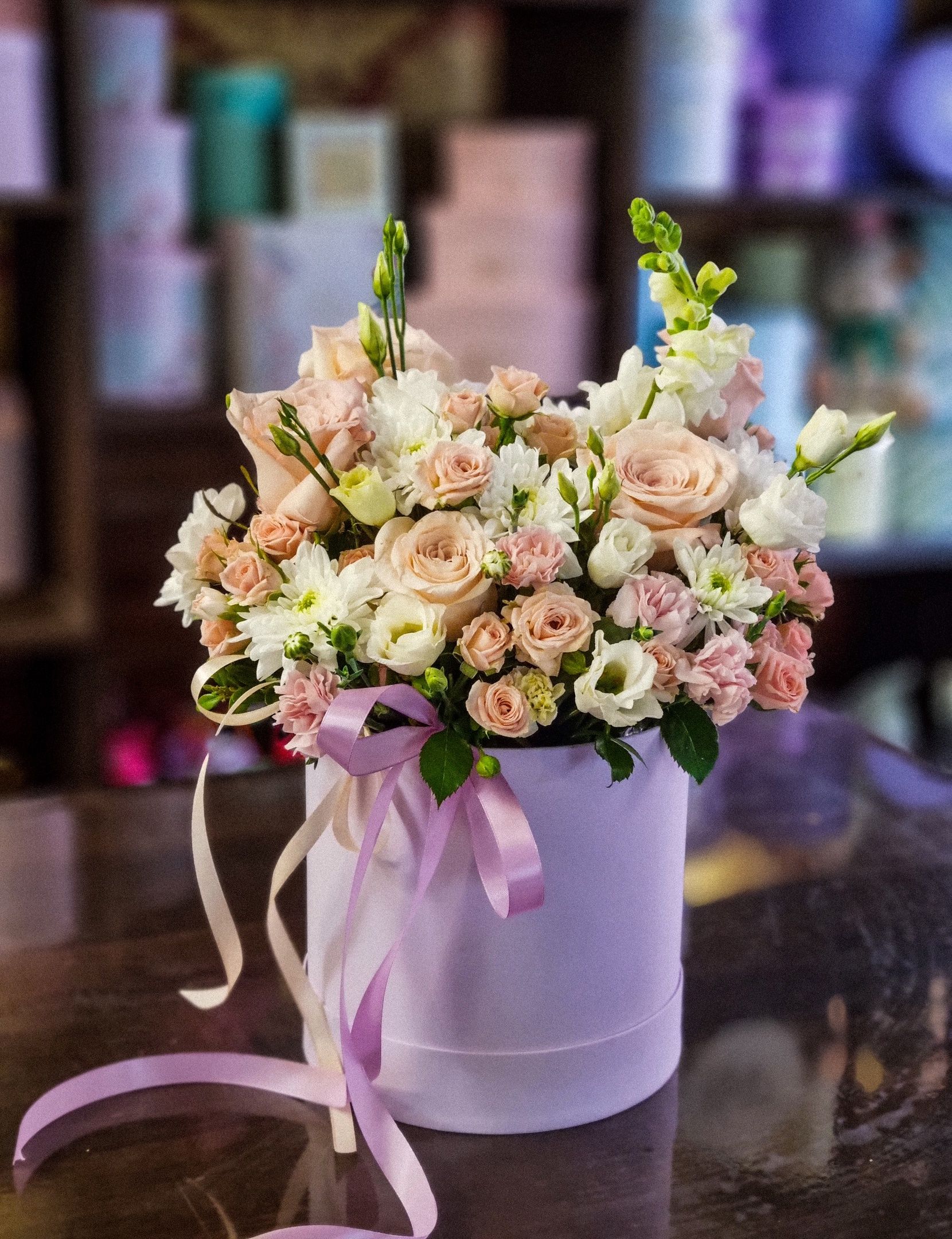 Композиция из: кустовой розы, эустомы, кустовой хризантемы, роз, гвоздики.