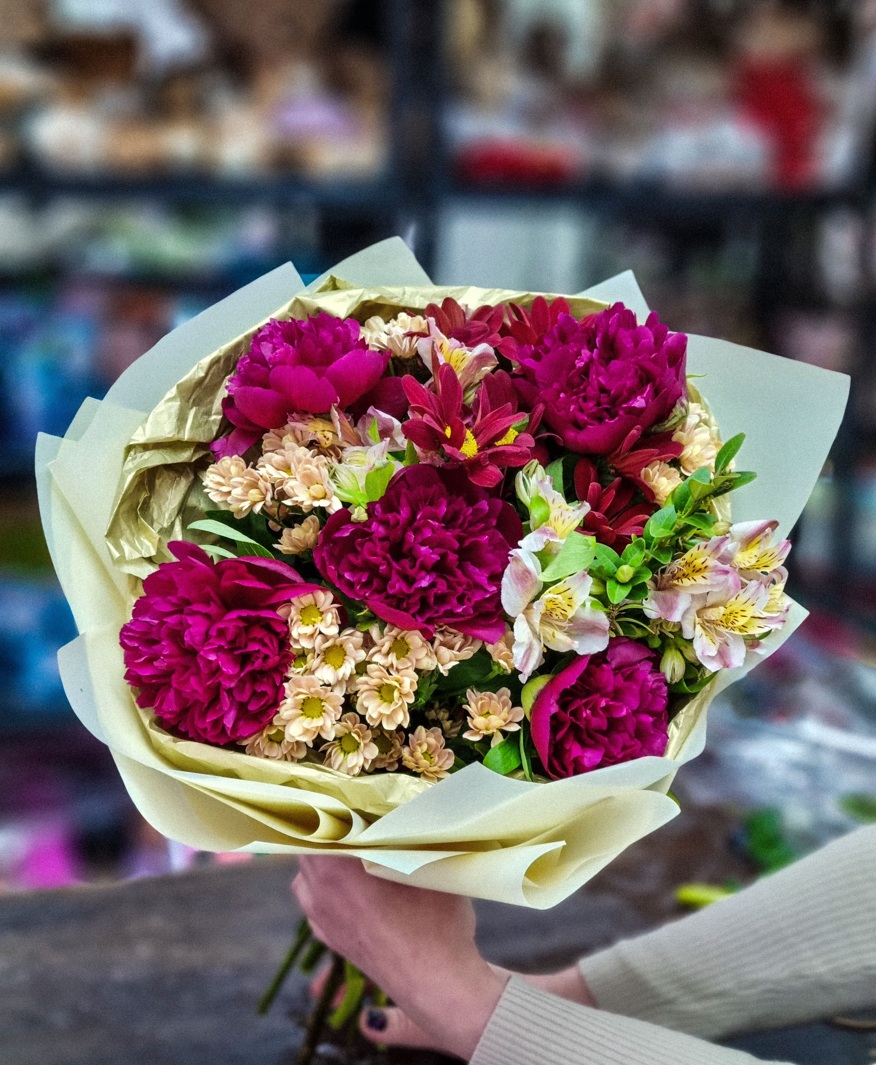 Букет из: пионов, кустовой хирзантемы, альстромерии.