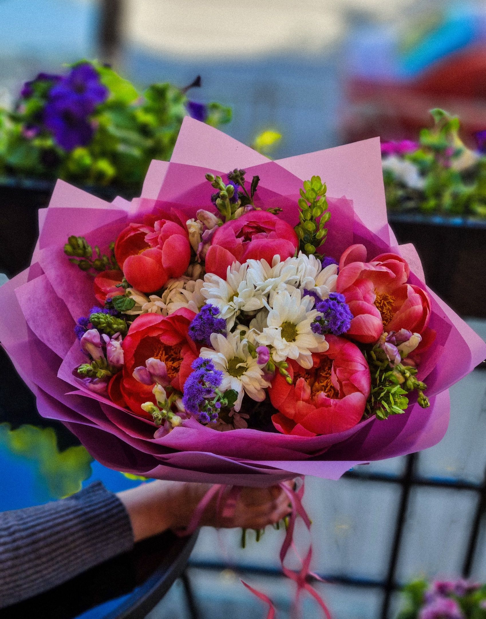 Букет из: кустовой хризантемы, статицы, пионов, львиного зева.