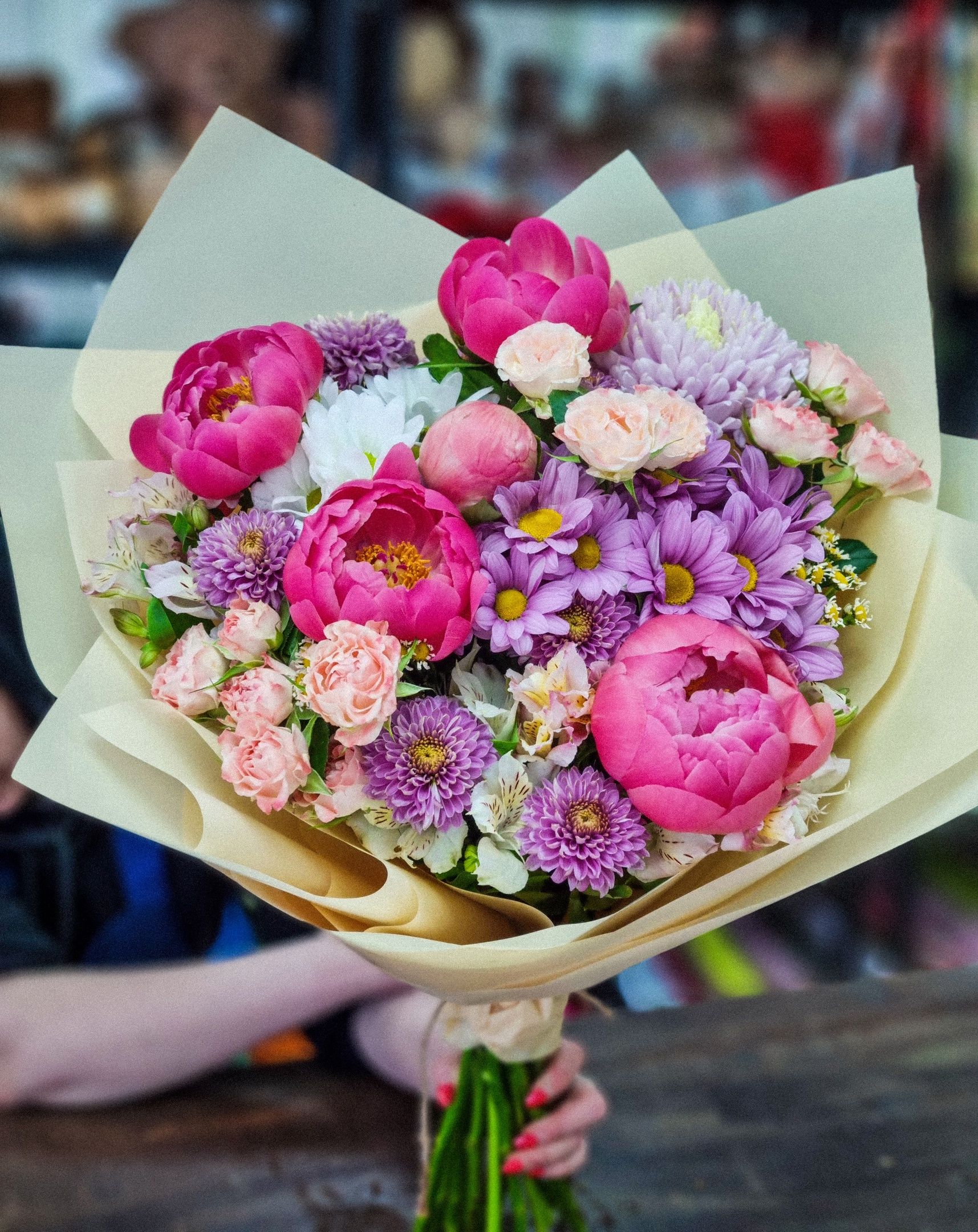 Букет из: кустовой хризантемы, пионов, одноголовой хризантемы, кустовой розы, альстромерии, танацетума.