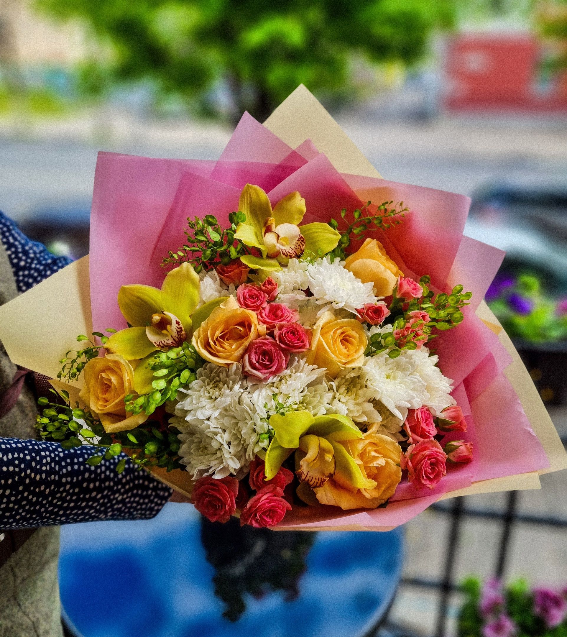 Букет из: калл, кустовой розы, роз, кустовой хризантемы.