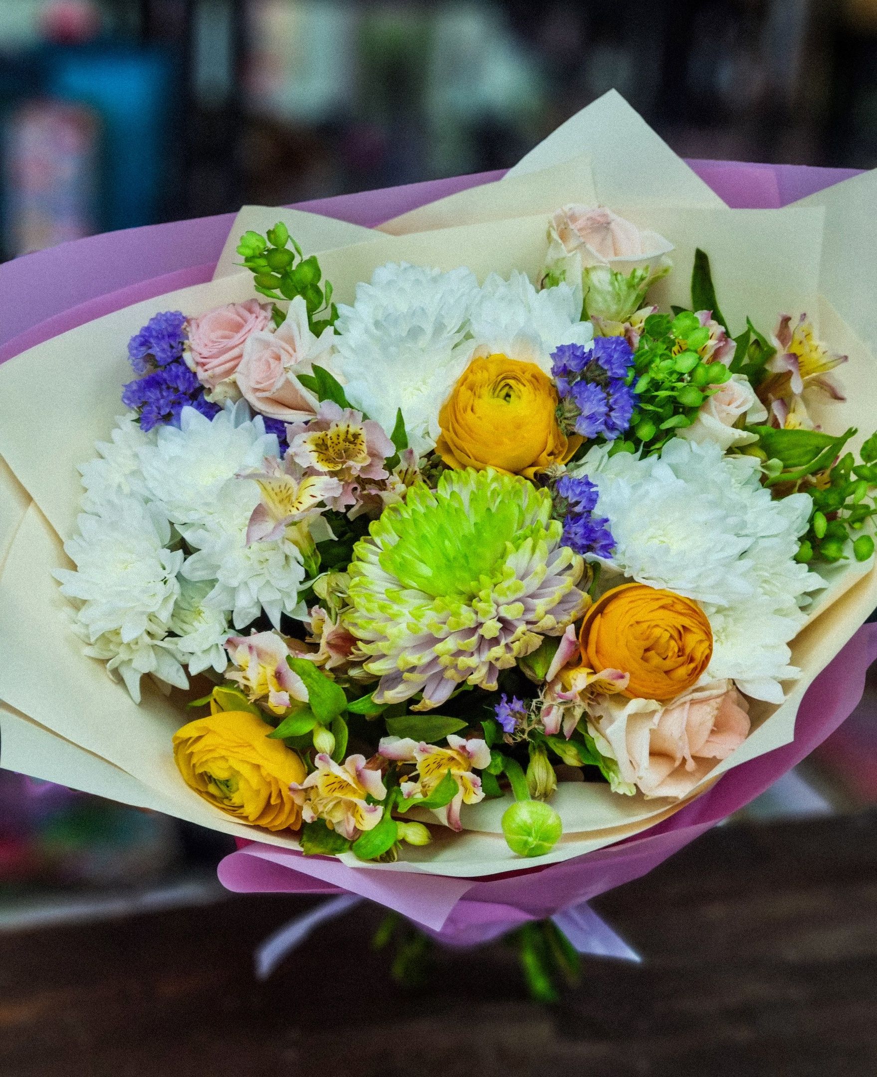 Букет из: кустовой хризантемы, статицы, альстромерии, одноголовой хризантемы, роз, ранункулюса.