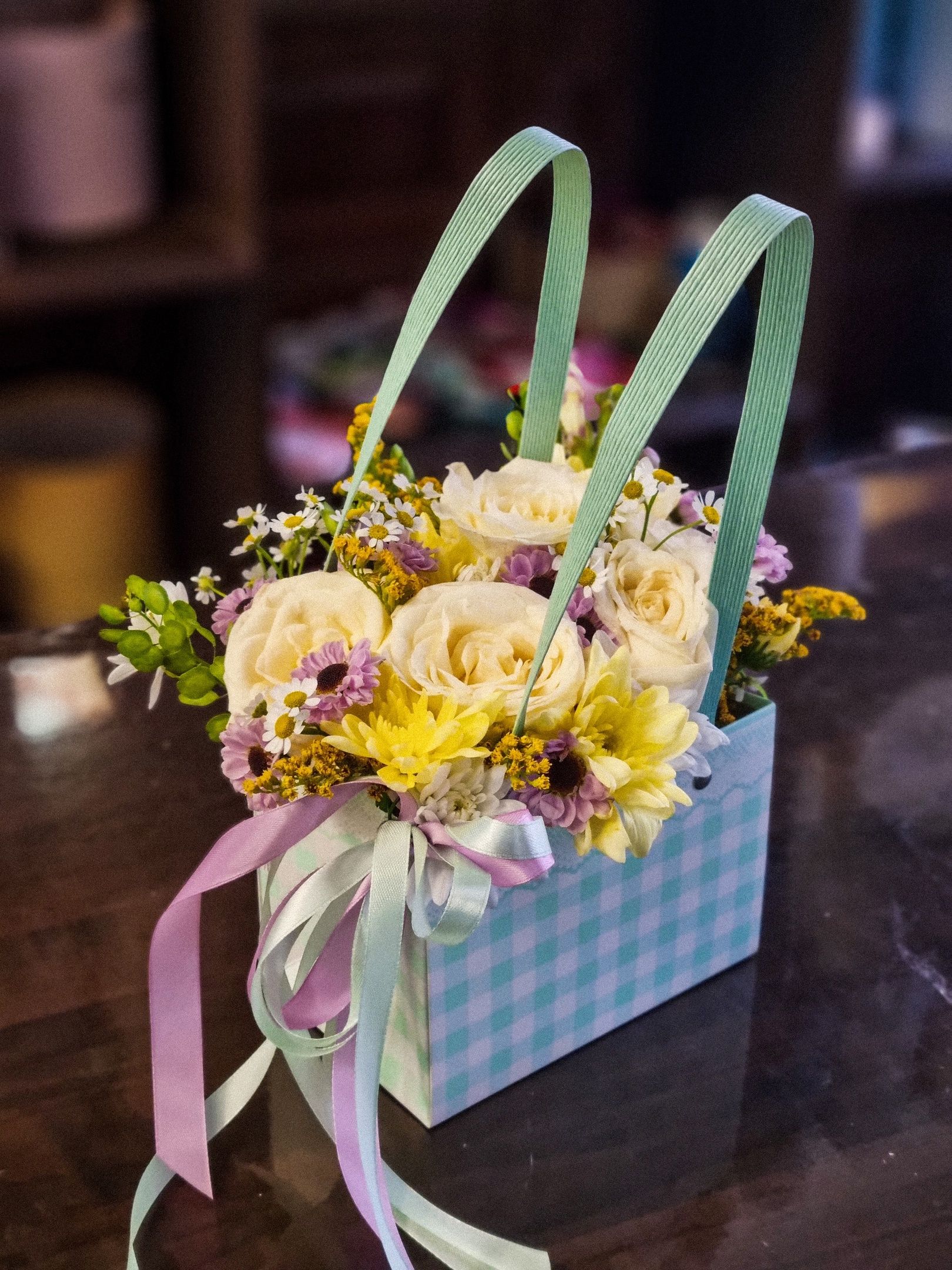Композиция из: роз, сантини, кустовой хризантемы, танацетума.