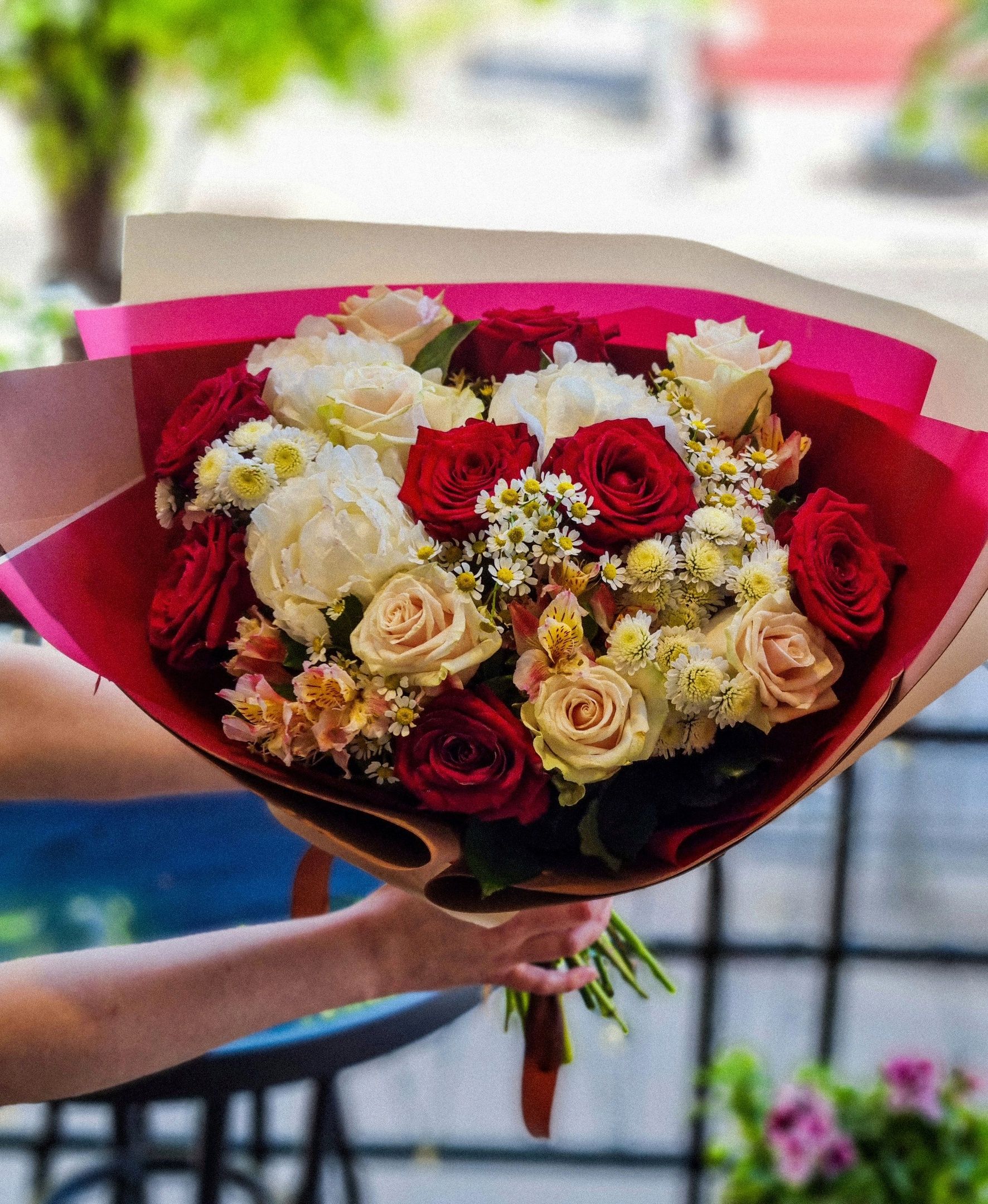 Букет из: роз, альстромерии, танацетума, кустовой хризантемы.