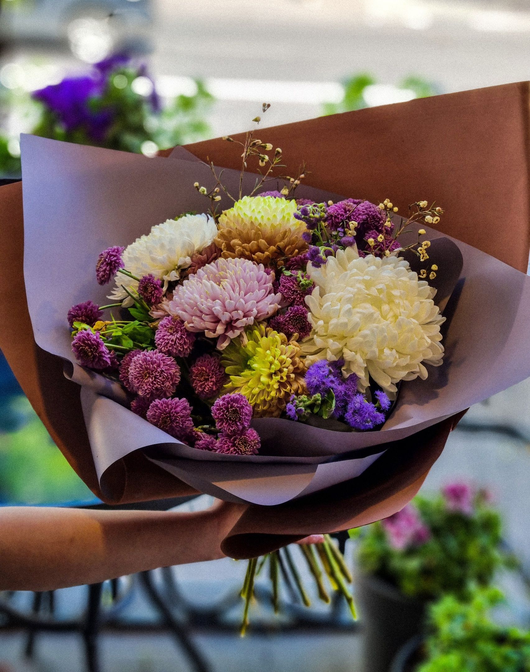 Букет из: одноголовой хризантемы, сантини, статицы, ваксфлауэра.