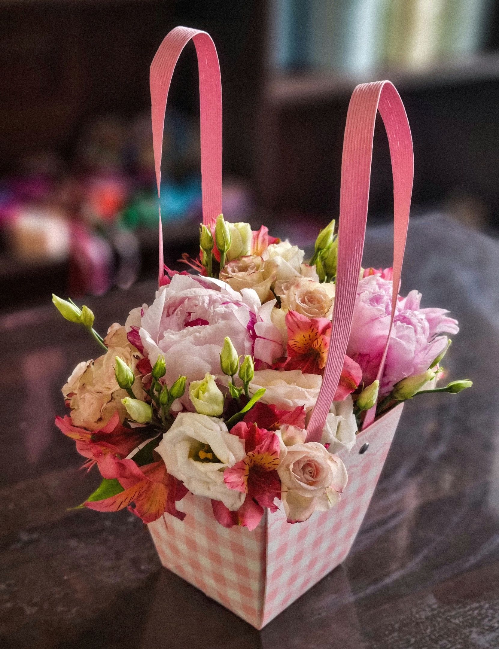 Композиция из: кустовой розы, альстромерии, эустомы, пионов.