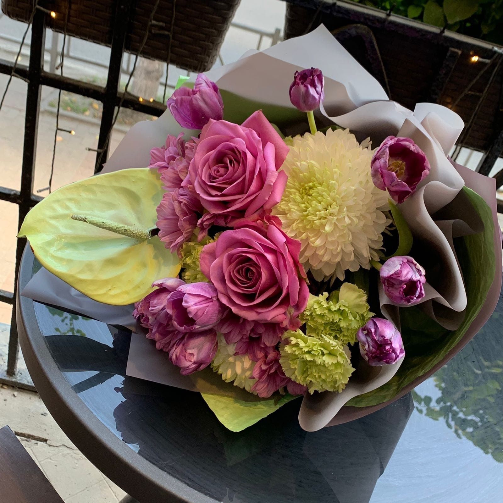 Букет из: тюльпанов, одноголовой хризантемы, роз, гвоздики, кустовой хризантемы.