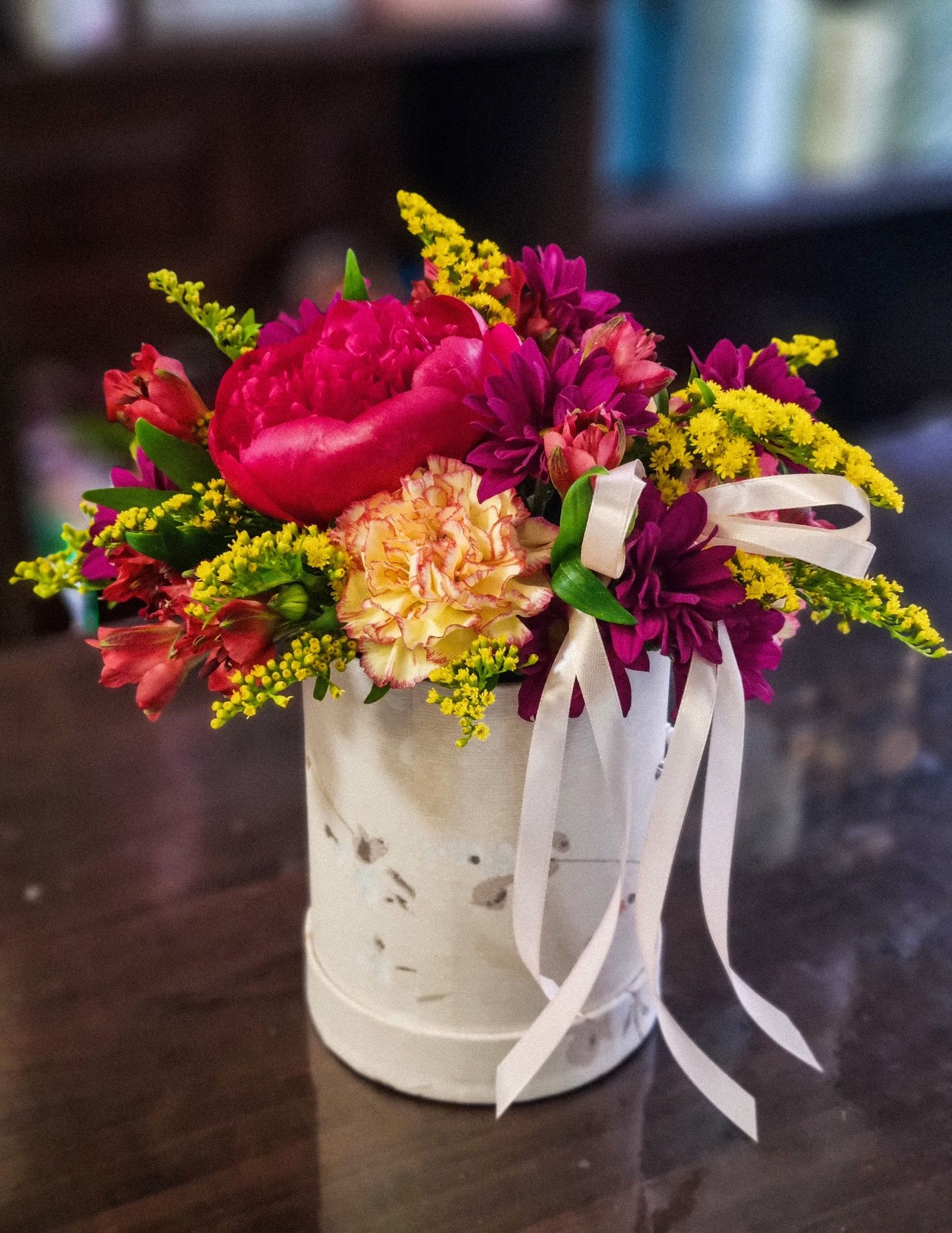 Композиция из: гвоздики, пионов, кустовой хризантемы, альстромерии.