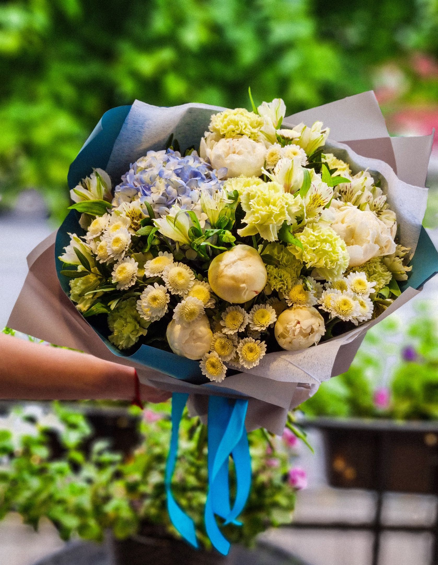 Букет из: пионов, кустовой хризантемы, альстромерии, гортензии, гвоздики.