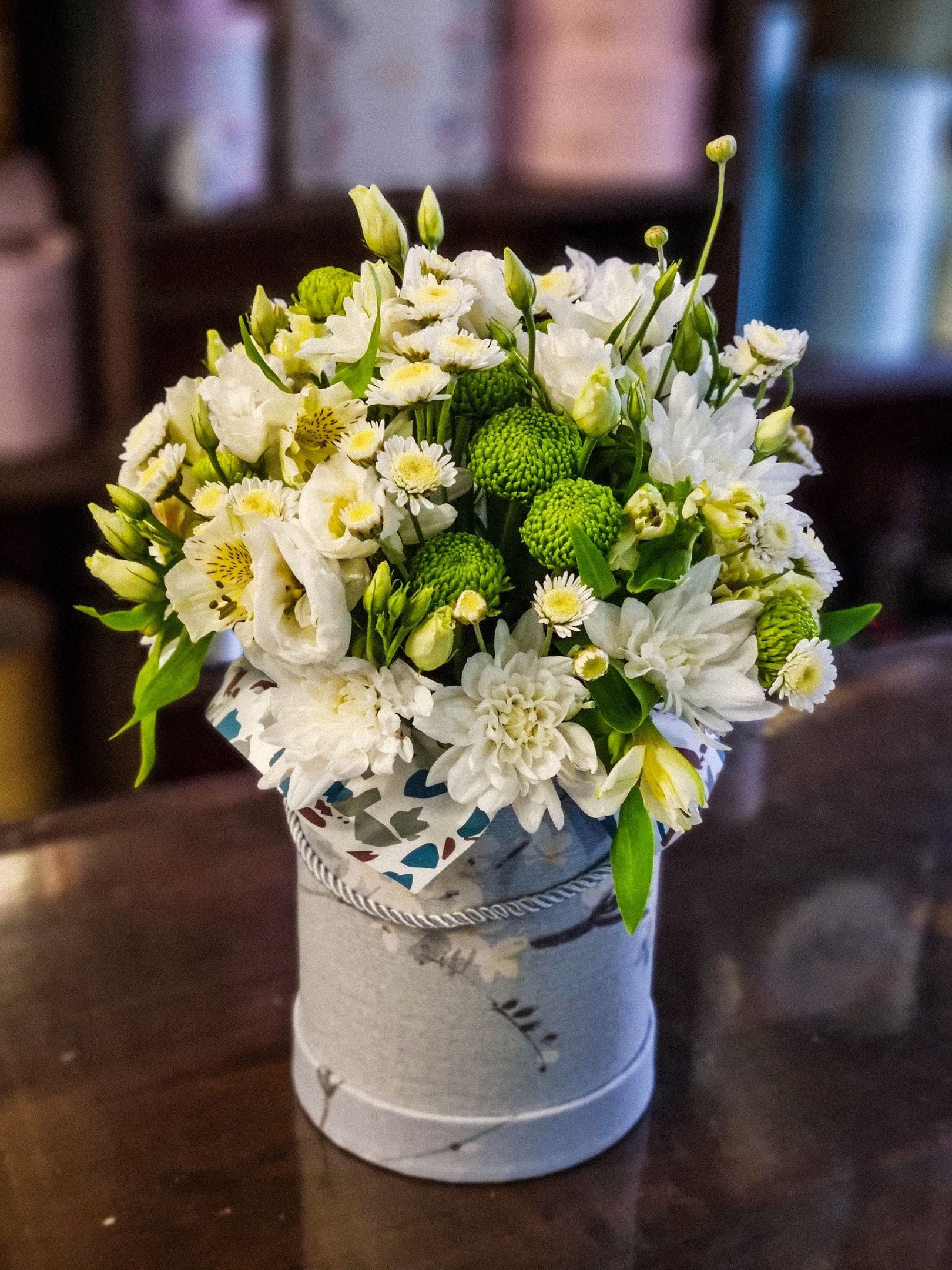 Композиция из: эустомы, альстромерии, кустовой хризантемы.