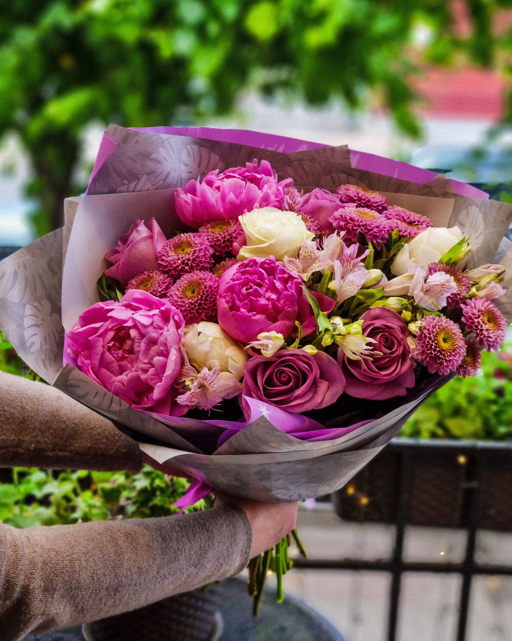 Букет из: пионов, альстромерии, роз, кустовой хризантемы.