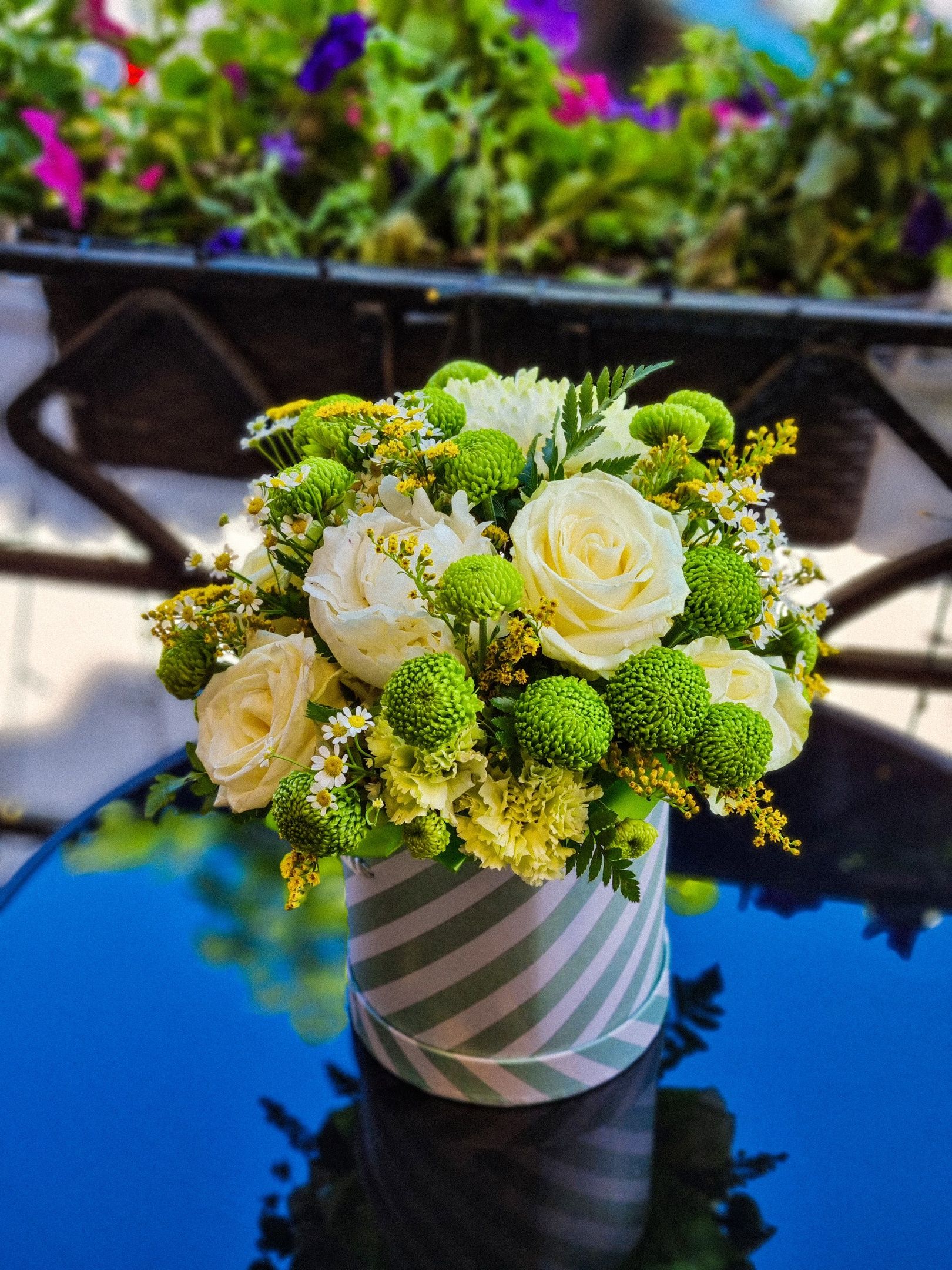 Композиция из: кустовой хризантемы, роз, одноголовой хризантемы, танацетума, пиона, гвоздики.