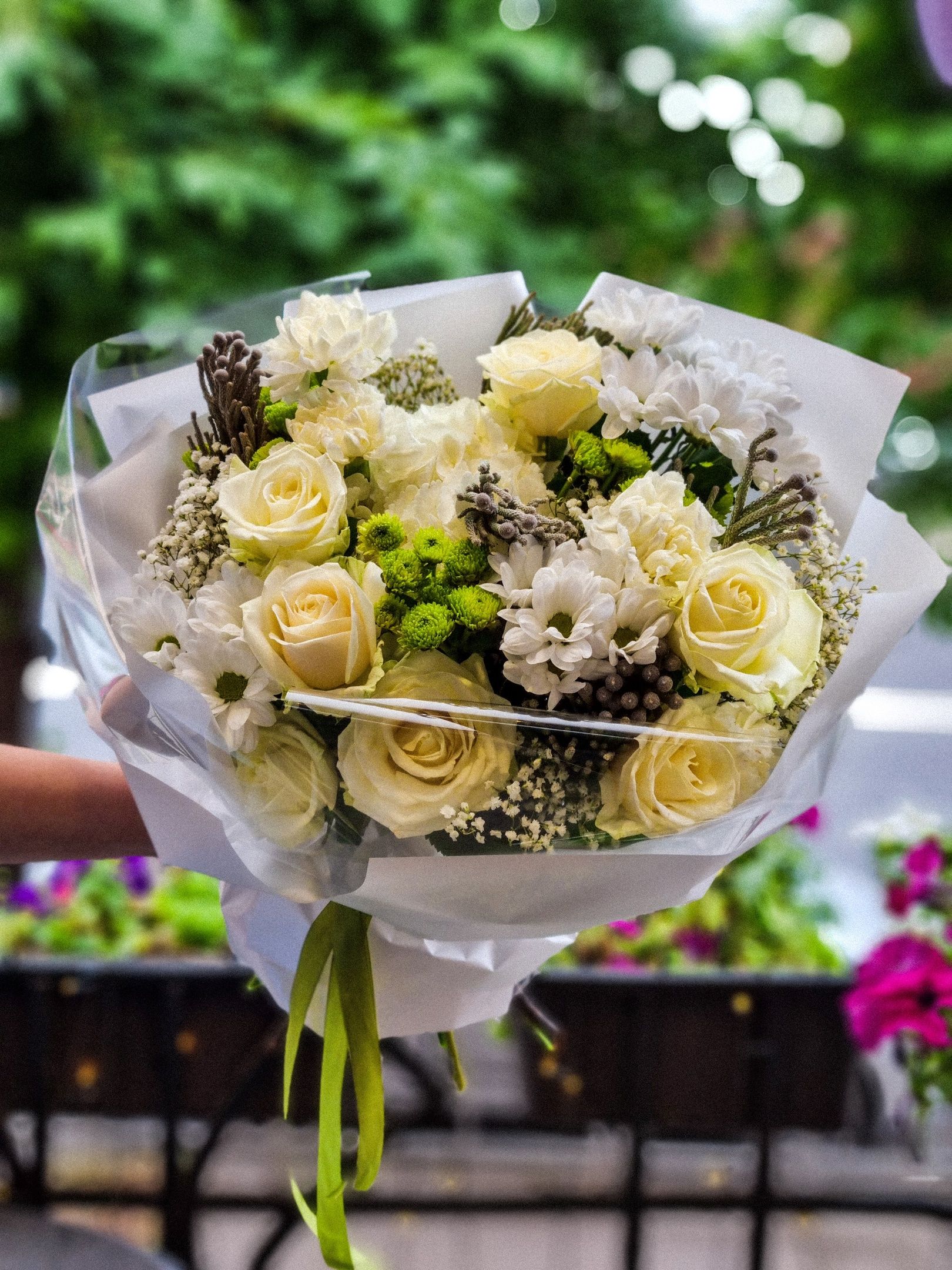 Букет из: роз, брунии, кустовой хризантемы, гипсофилы, пионов.