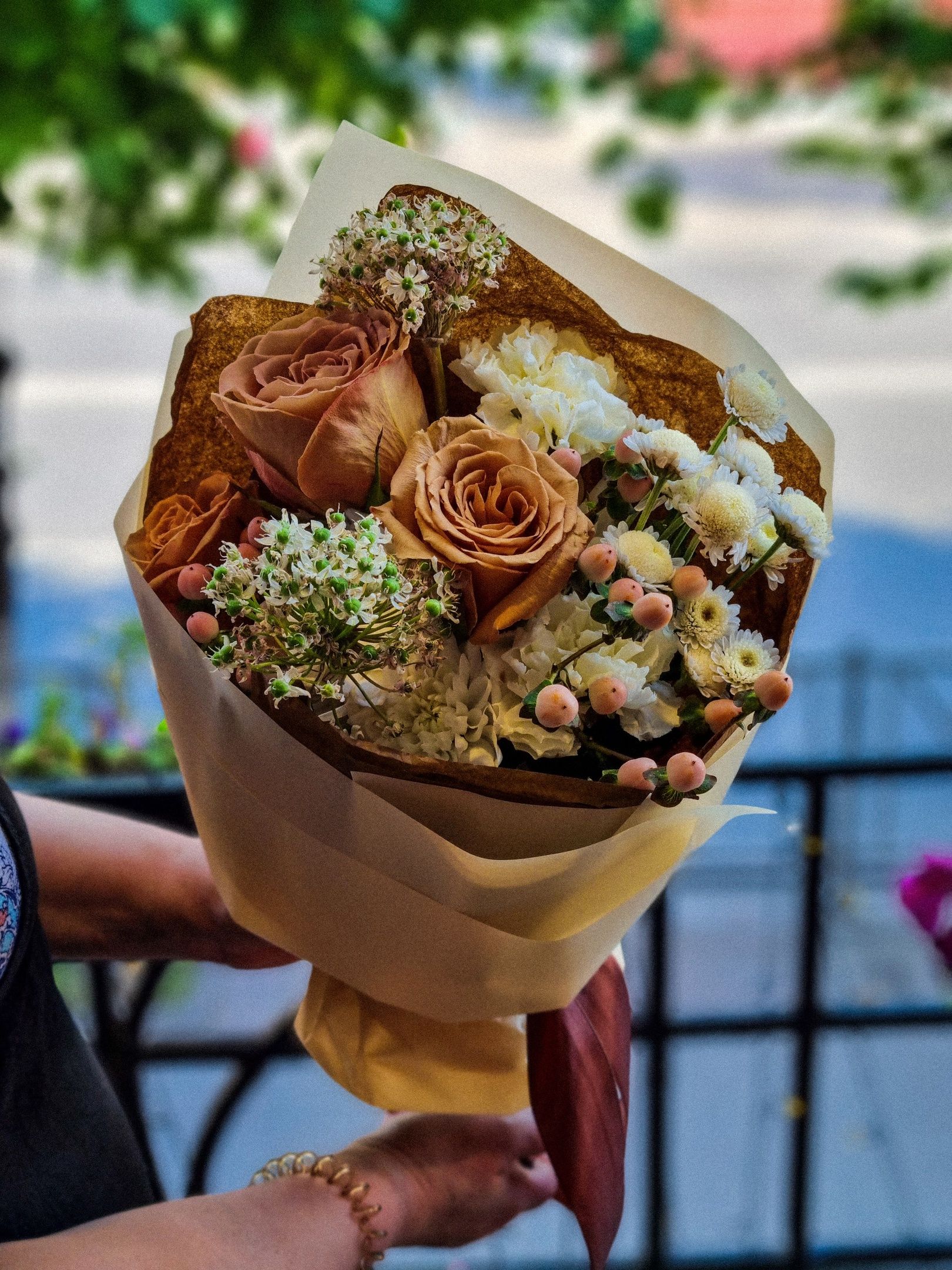 Букет из: роз, гиперикума, кустовой хризантемы, пионов.