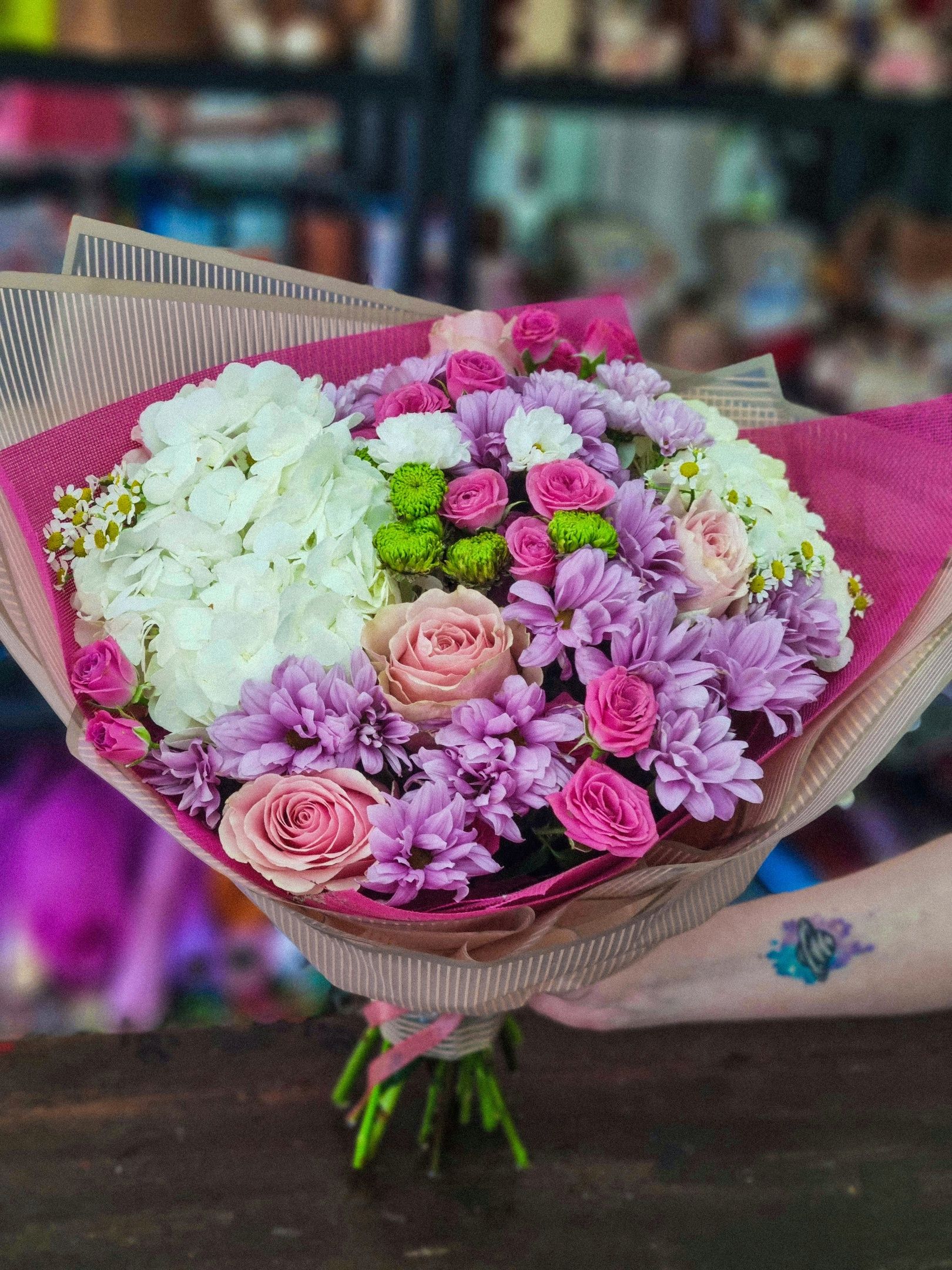 Букет из: роз, кустовой хризантемы, кустовой розы, танацетума.