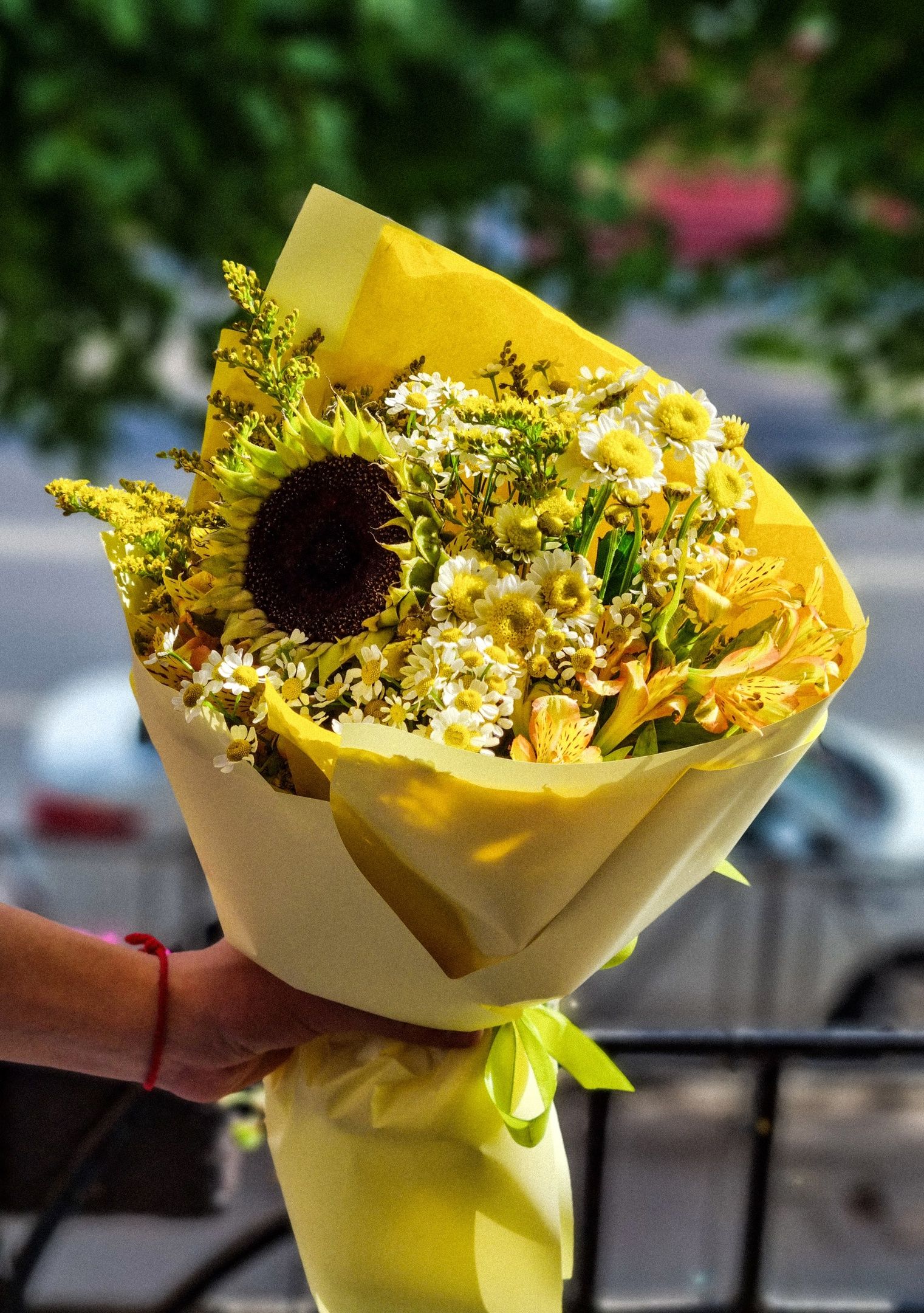 Букет из: подсолнуха, танацетума, сантини, альстромерии.