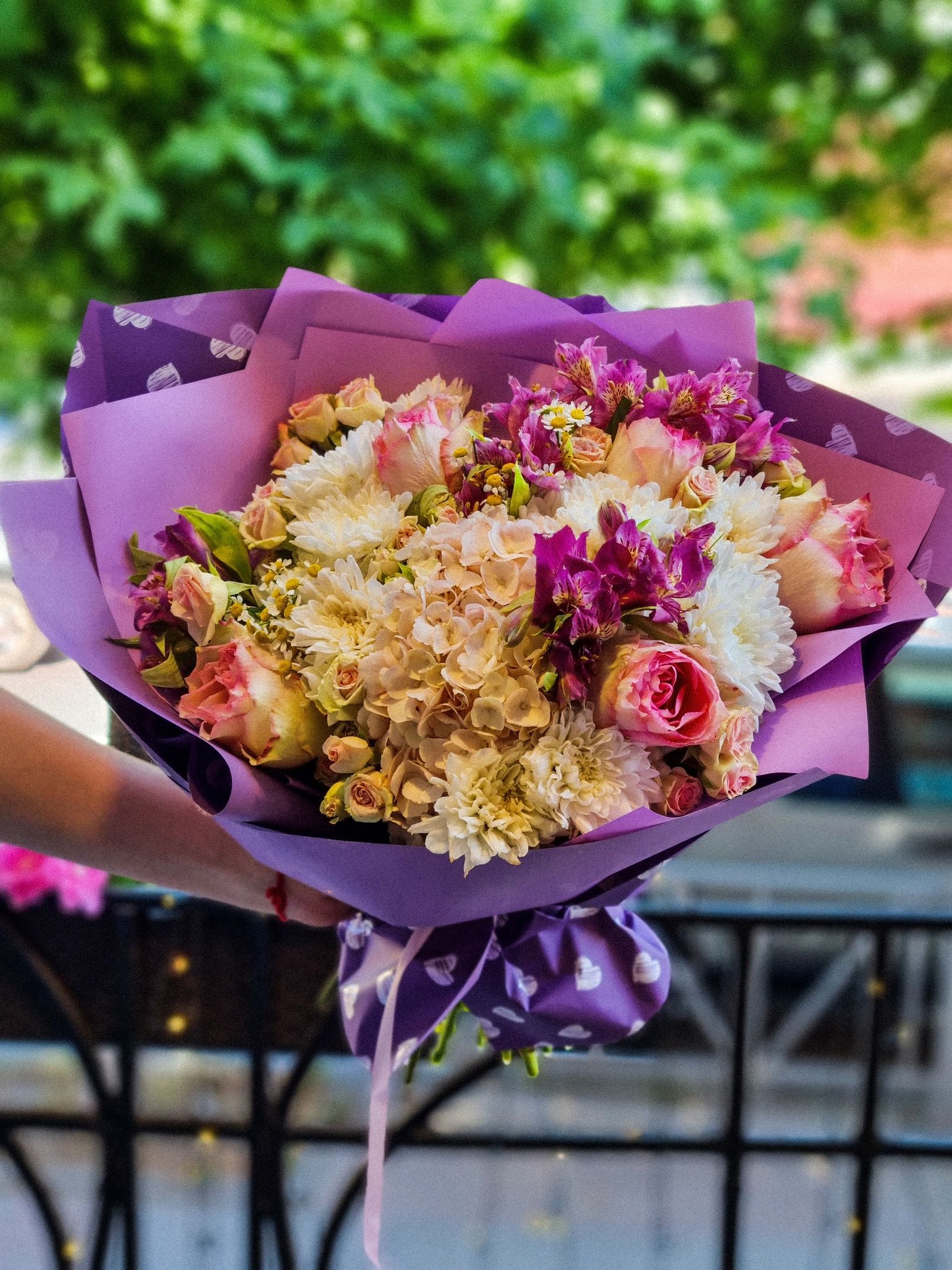 Букет из: кустовой хризантемы, гортензии, роз, кустовой розы, альстромерии, танацетума.