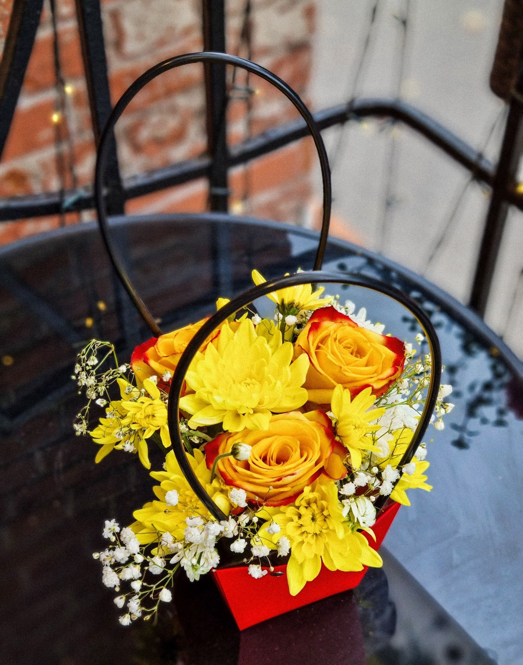 Композиция из: роз, кустовой хризантемы, гипсофилы.