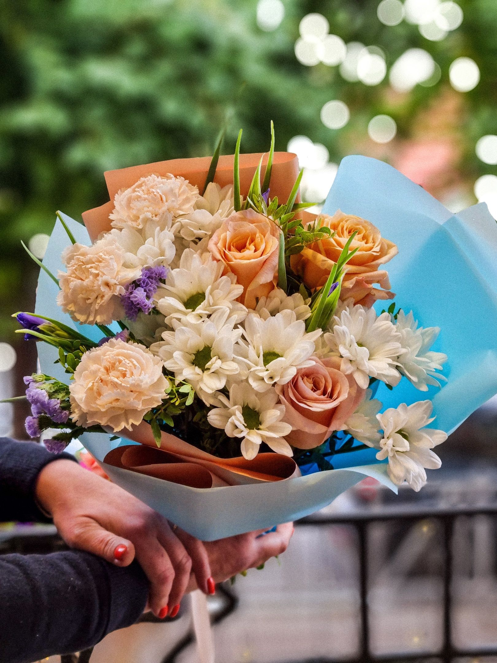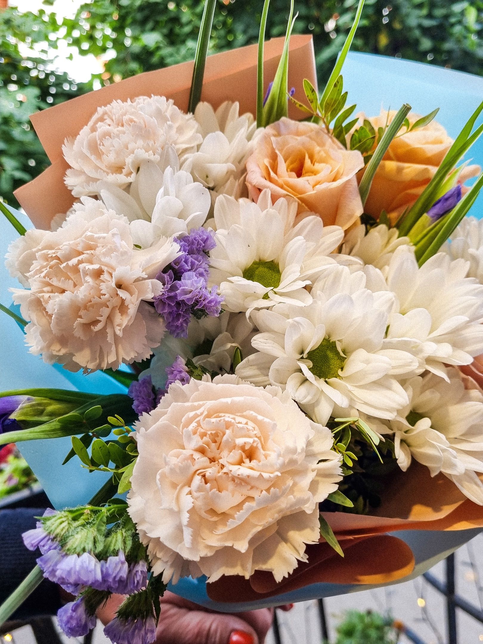 Букет из: роз, кустовой хризантемы, ирисов, статицы, гвоздики.