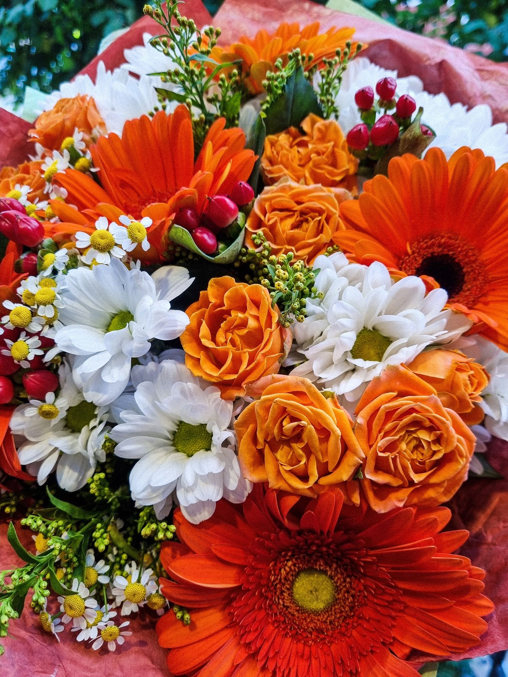 Букет из: кустовой хризантемы, гербера, кустовой розы, гиперикума, танацетума, солидаго.