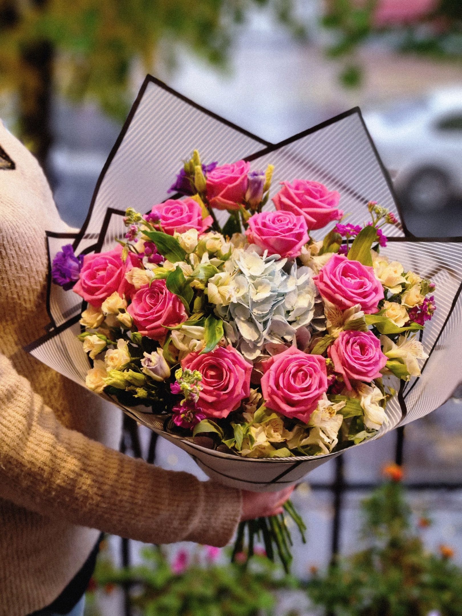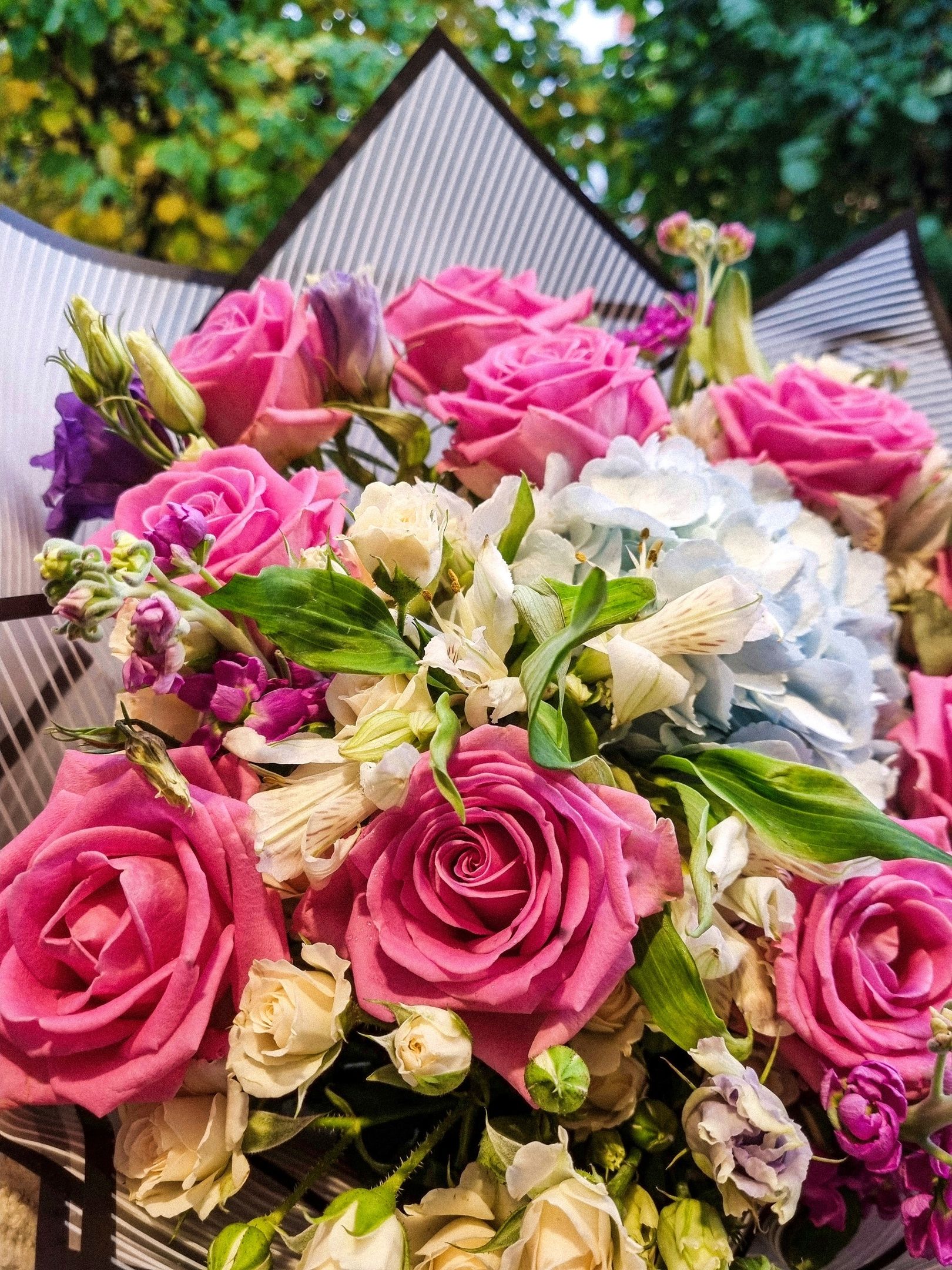 Букет из: роз, альстромерии, эустомы, гортензии, кустовой розы, маттиола.
