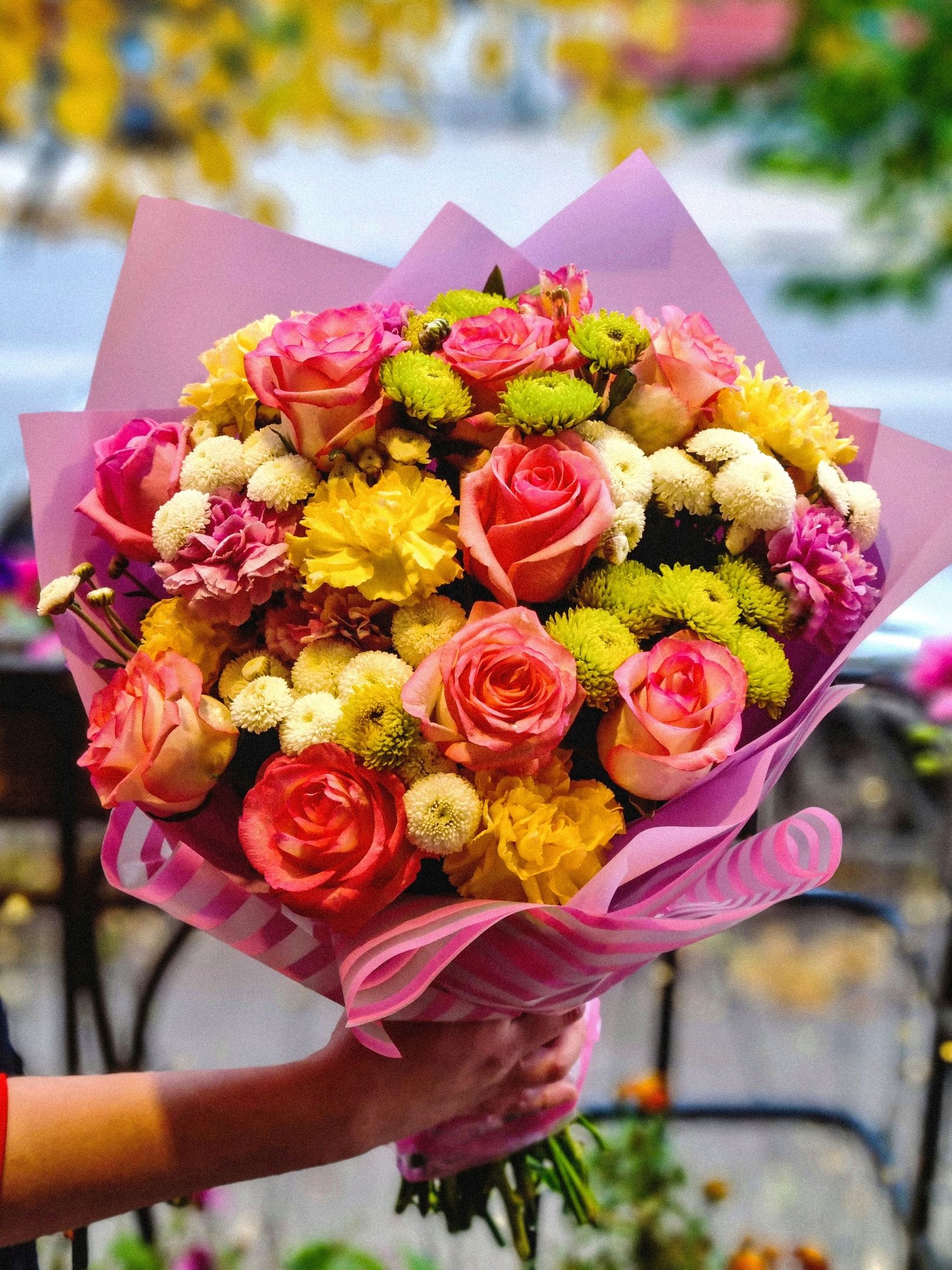 Букет из: роз, кустовой хризантемы, гвоздики.