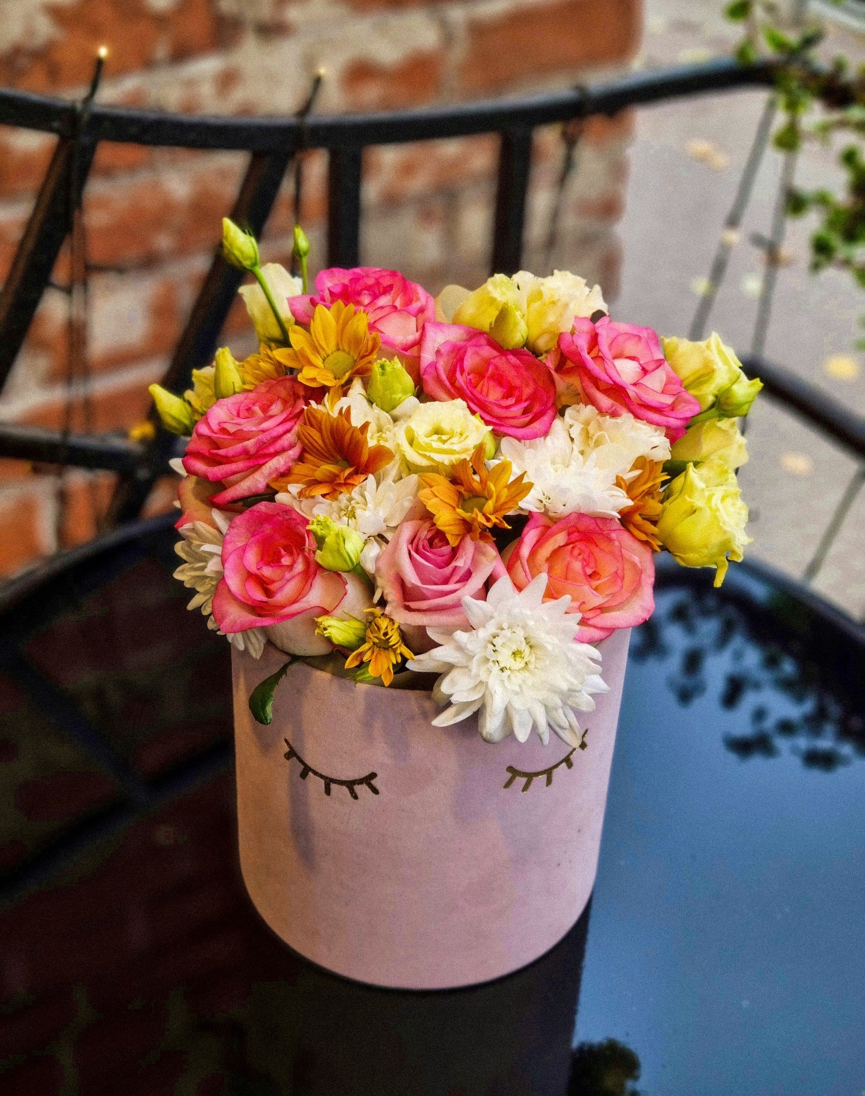 Композиция из: кустовой хризантемы, роз, эустомы.