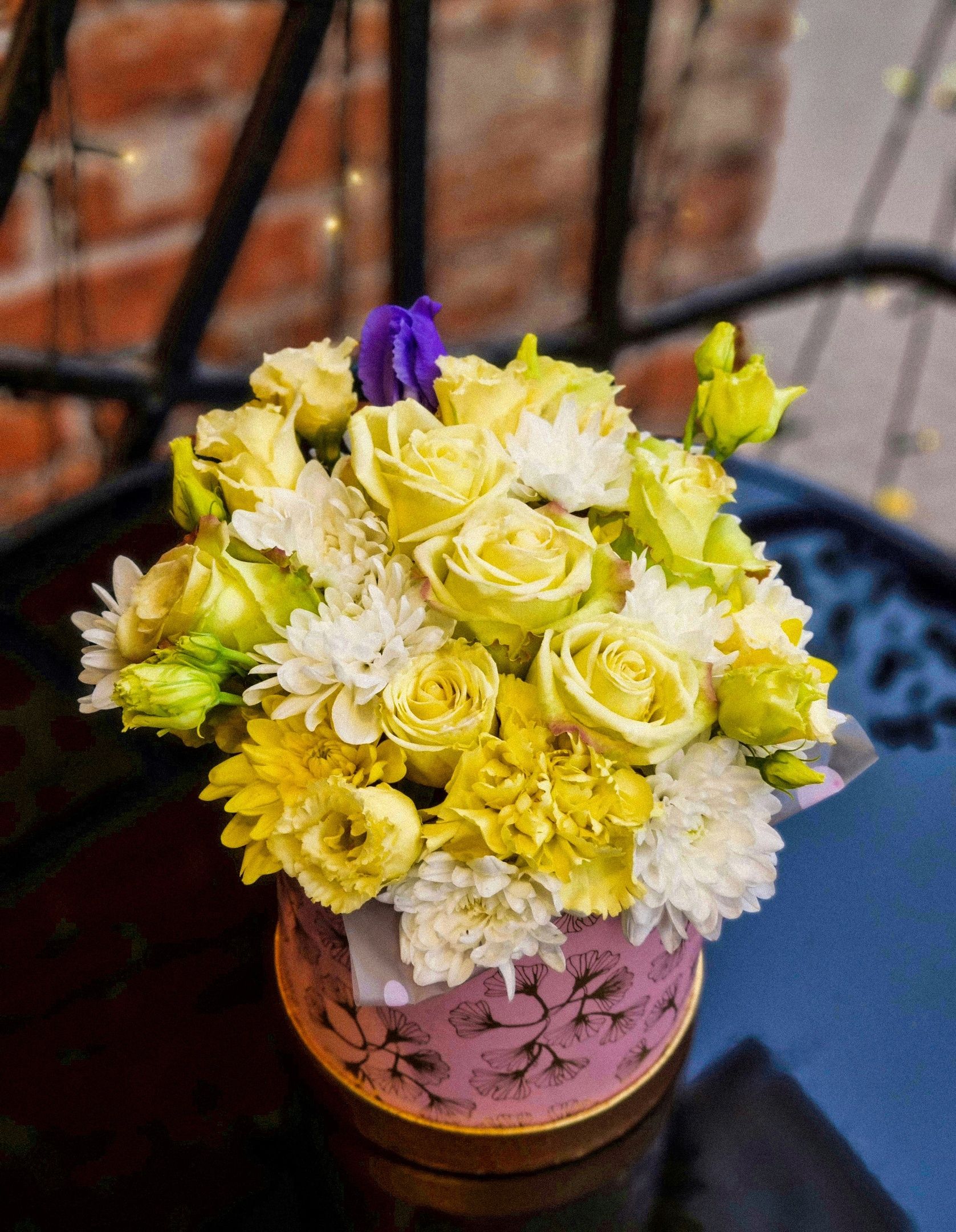 Композиция из: кустовой хризантемы, роз, эустомы.