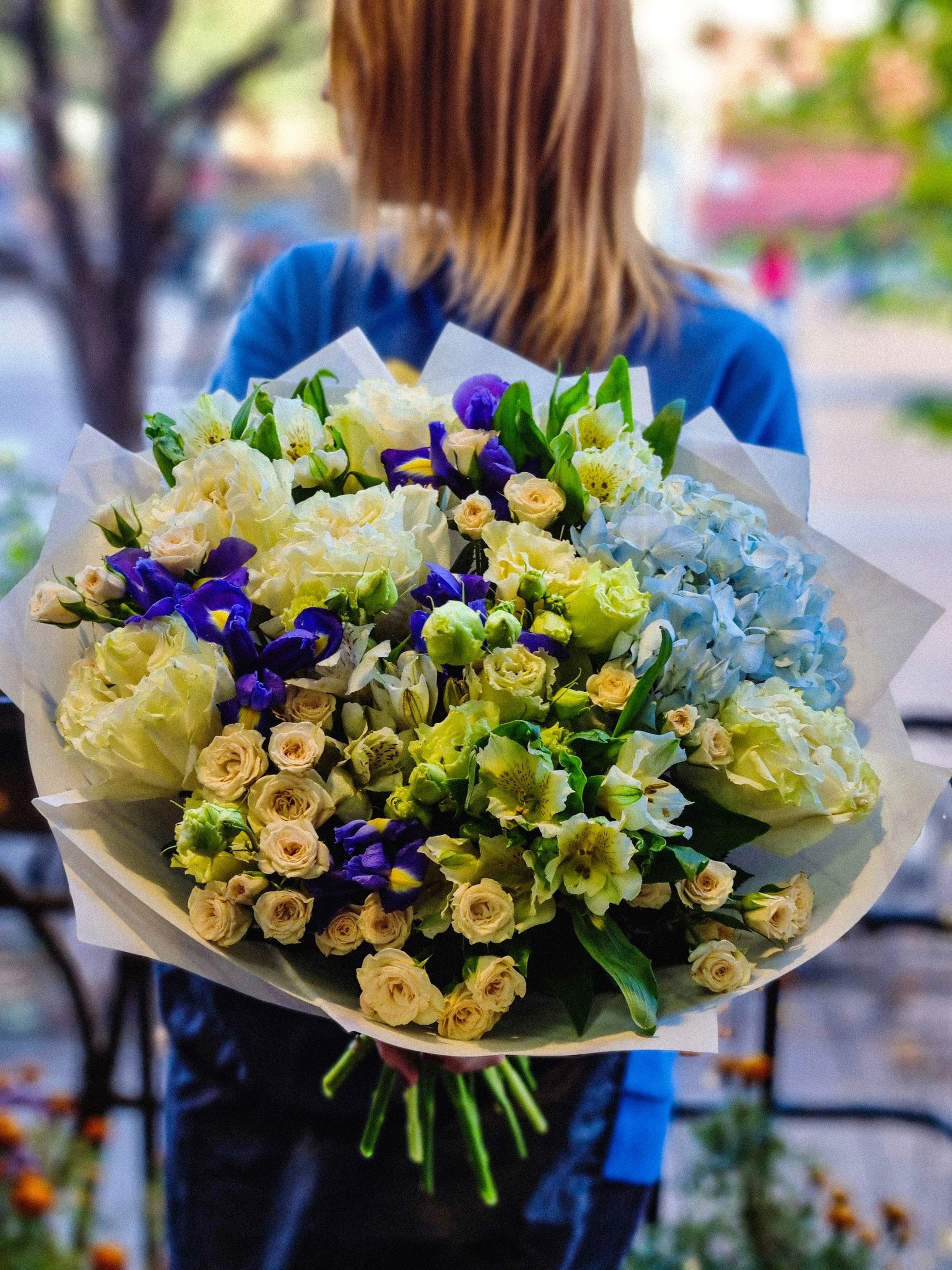 Букет из: альстромерии, кустовой розы, ирисов, роз, гортензии, эустомы.