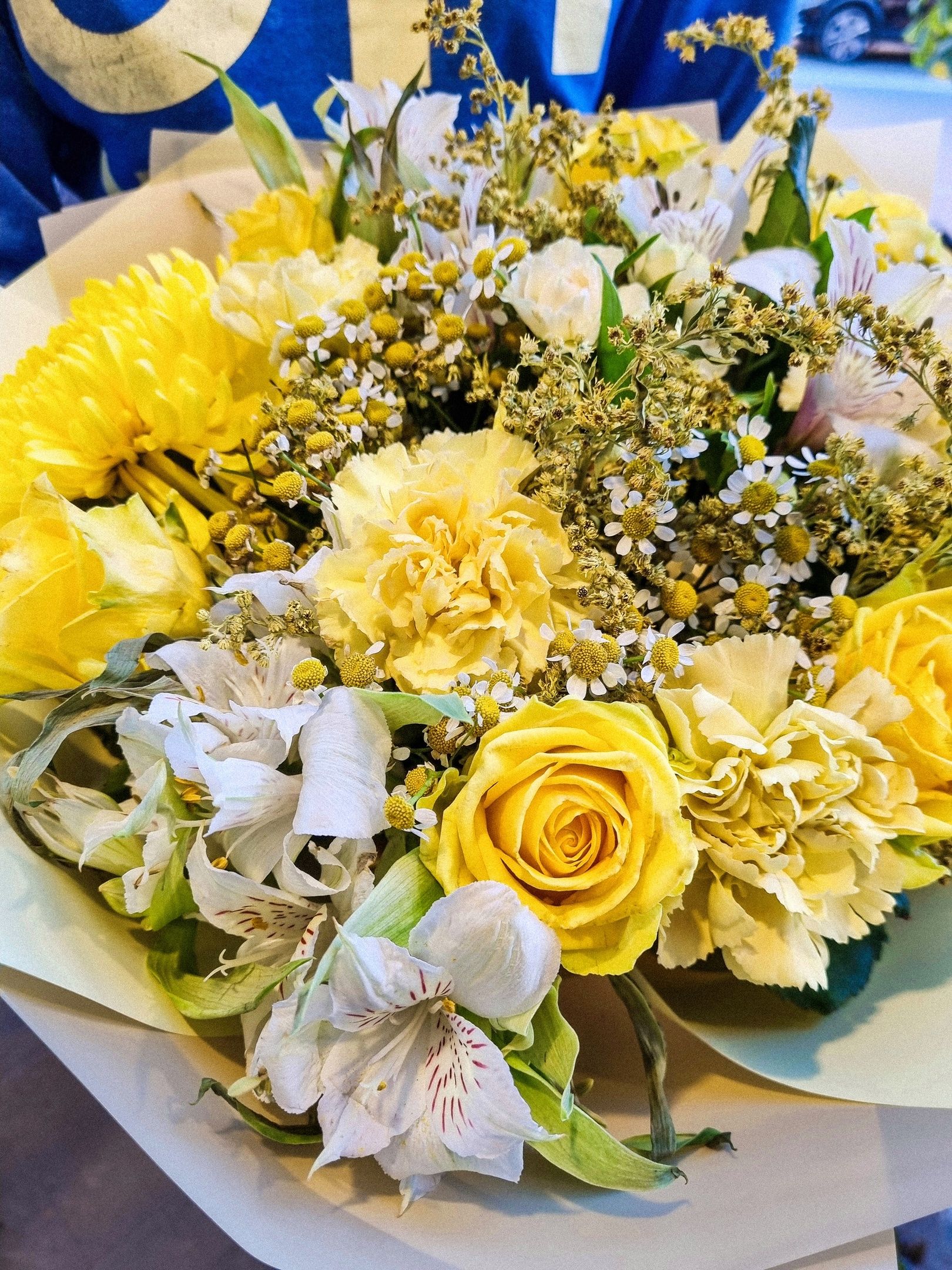 Букет из: альстромерии, одноголовой хризантемы, гвоздики, роз, танацетума, солидаго, кустовой розы.