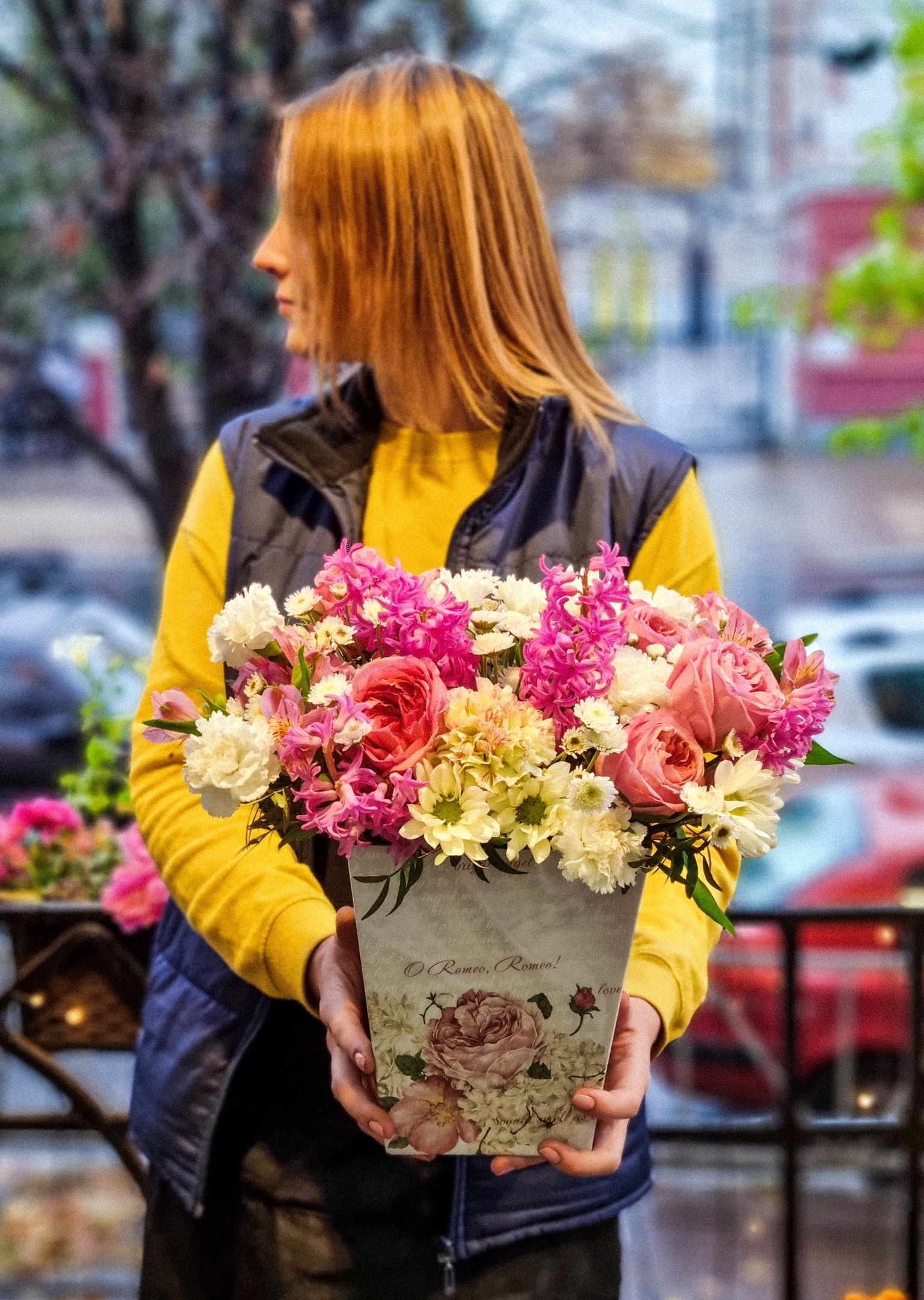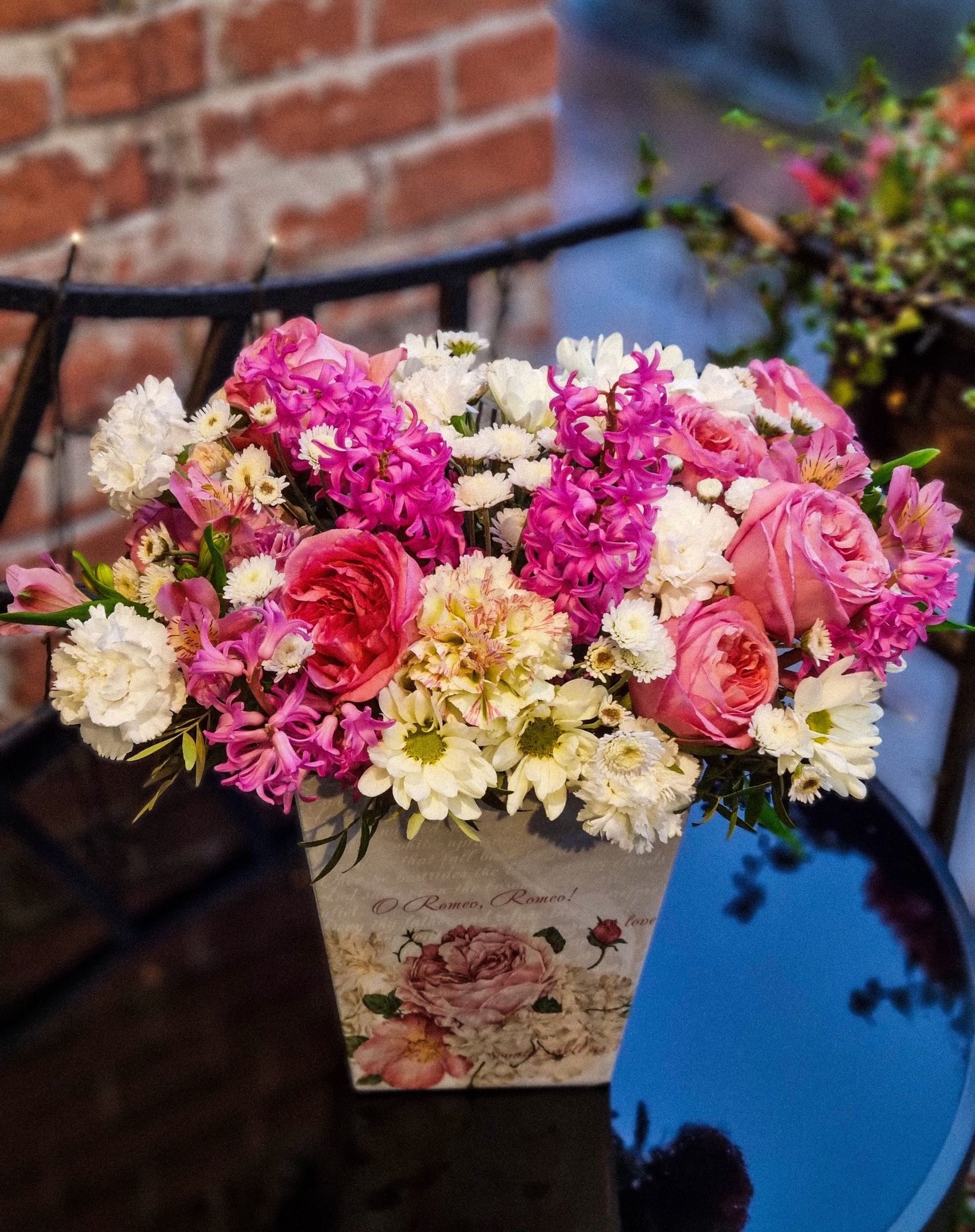 Композиция из: кустовой хризантемы, гвоздики, роз, альстромерии, гиацинтов.