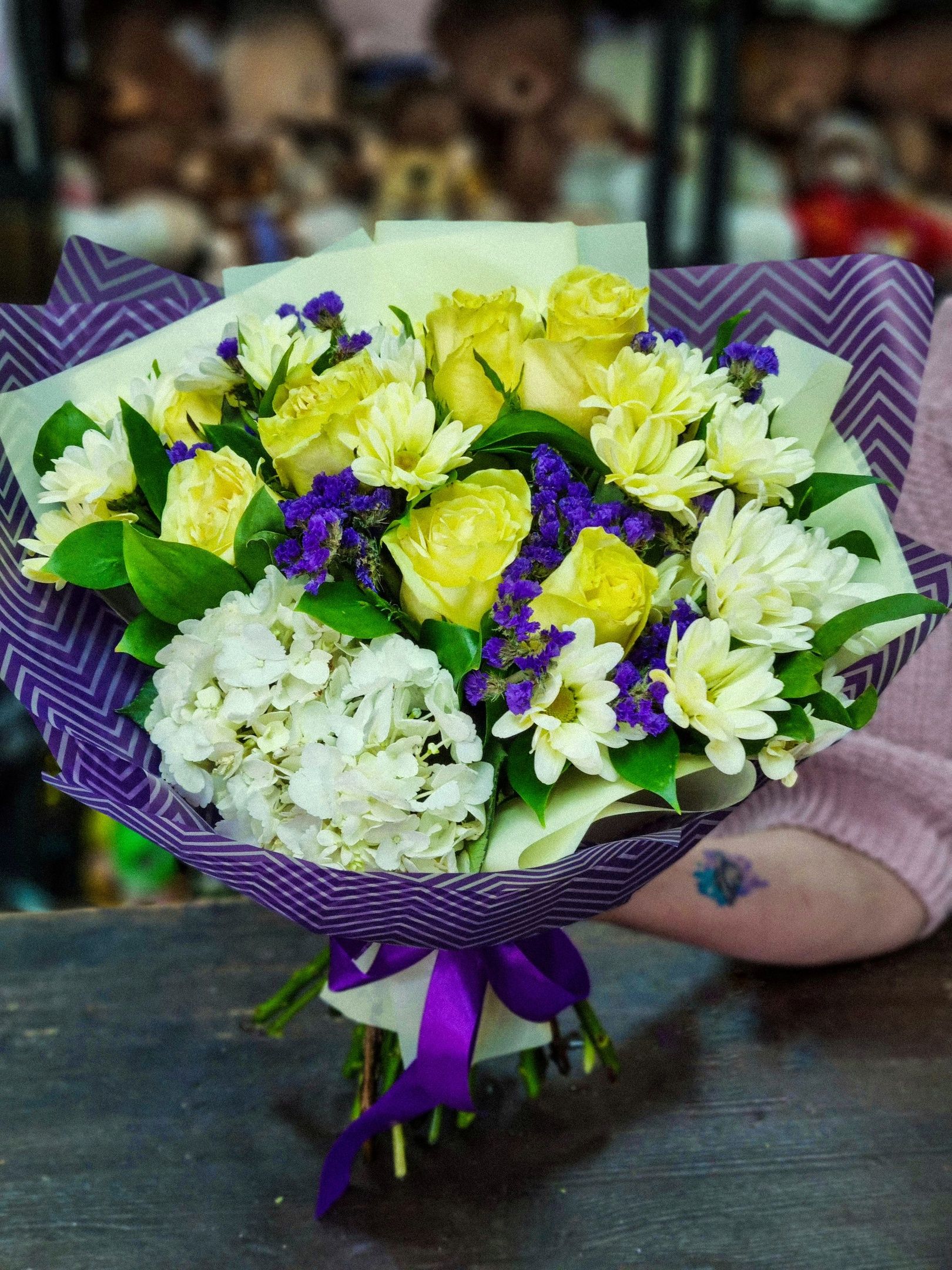 Букет из: гортензии, кустовой хризантемы, статицы, роз.