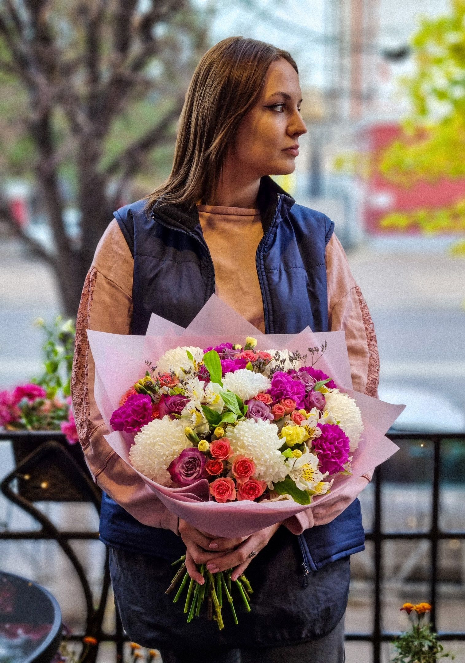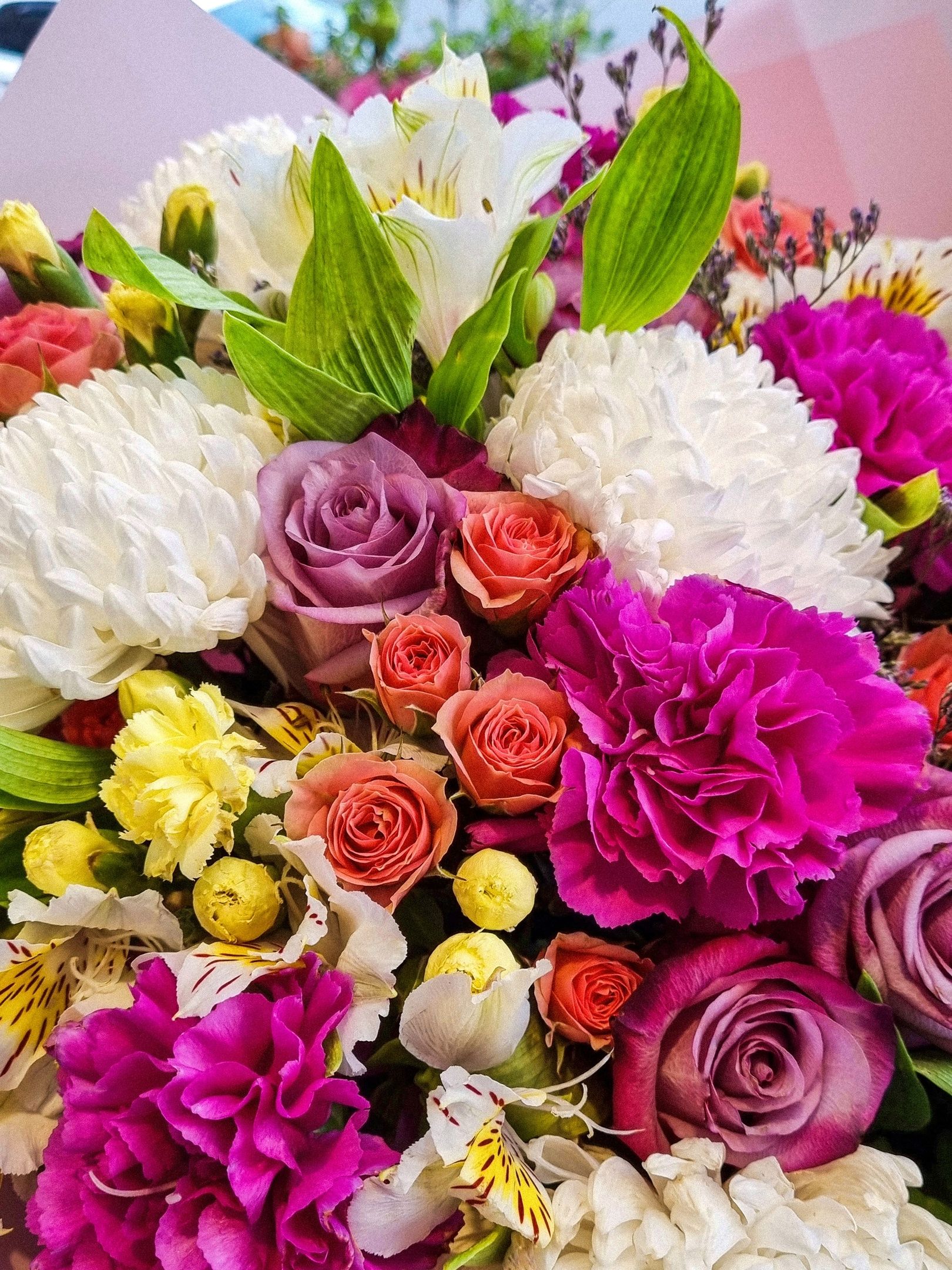 Букет из: роз, гвоздики, одноголовой хризантемы, альстромерии, кустовой розы.
