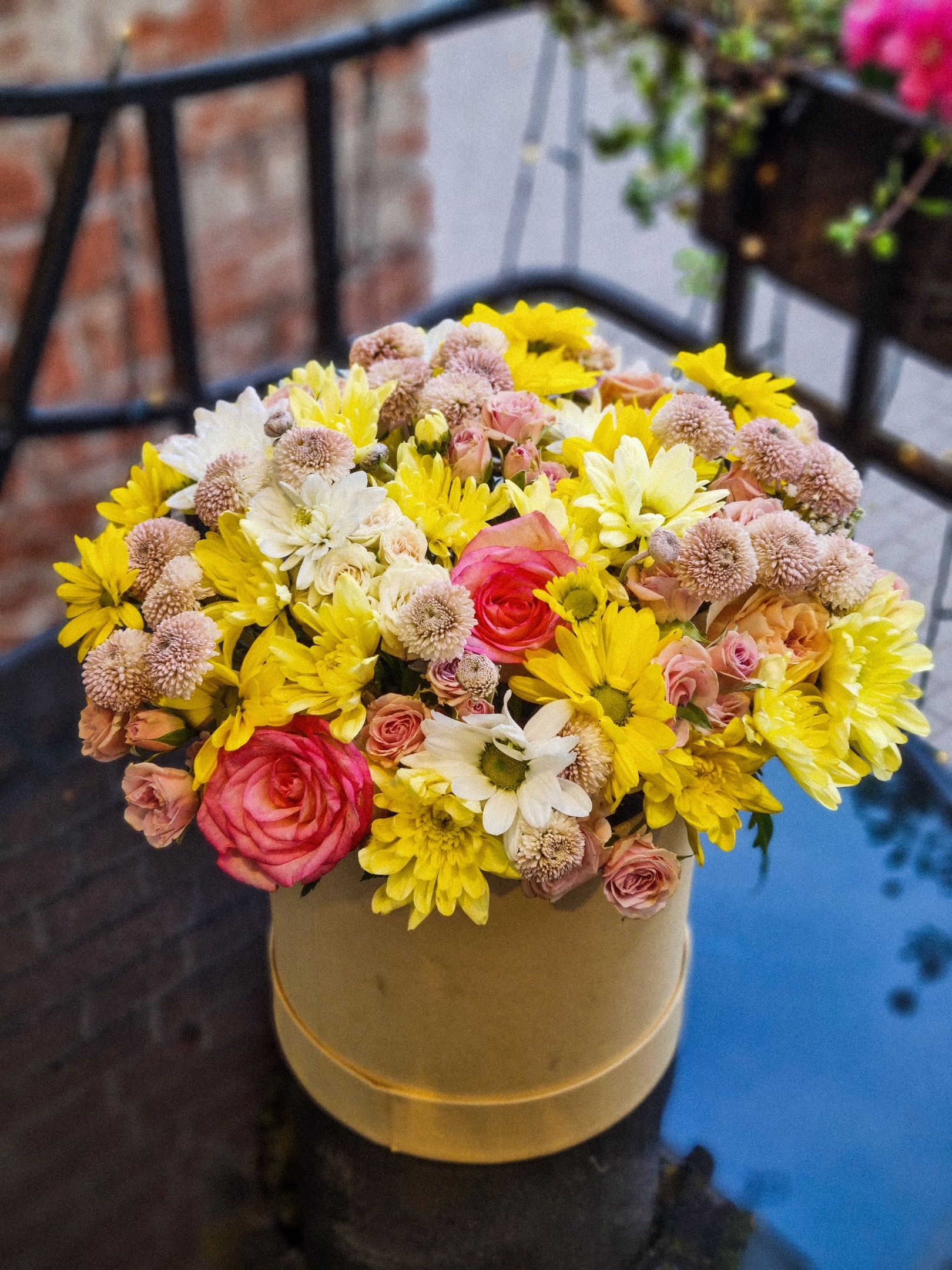 Композиция из: роз, кустовой хризантемы, кустовой розы, сантини.