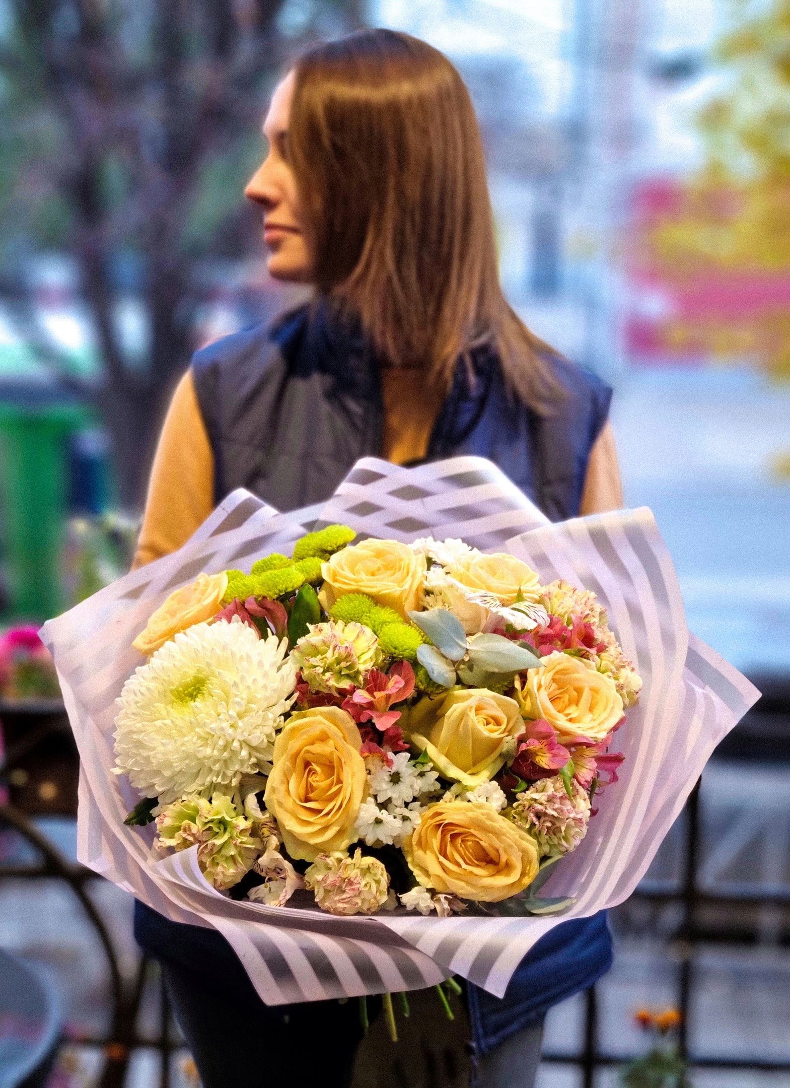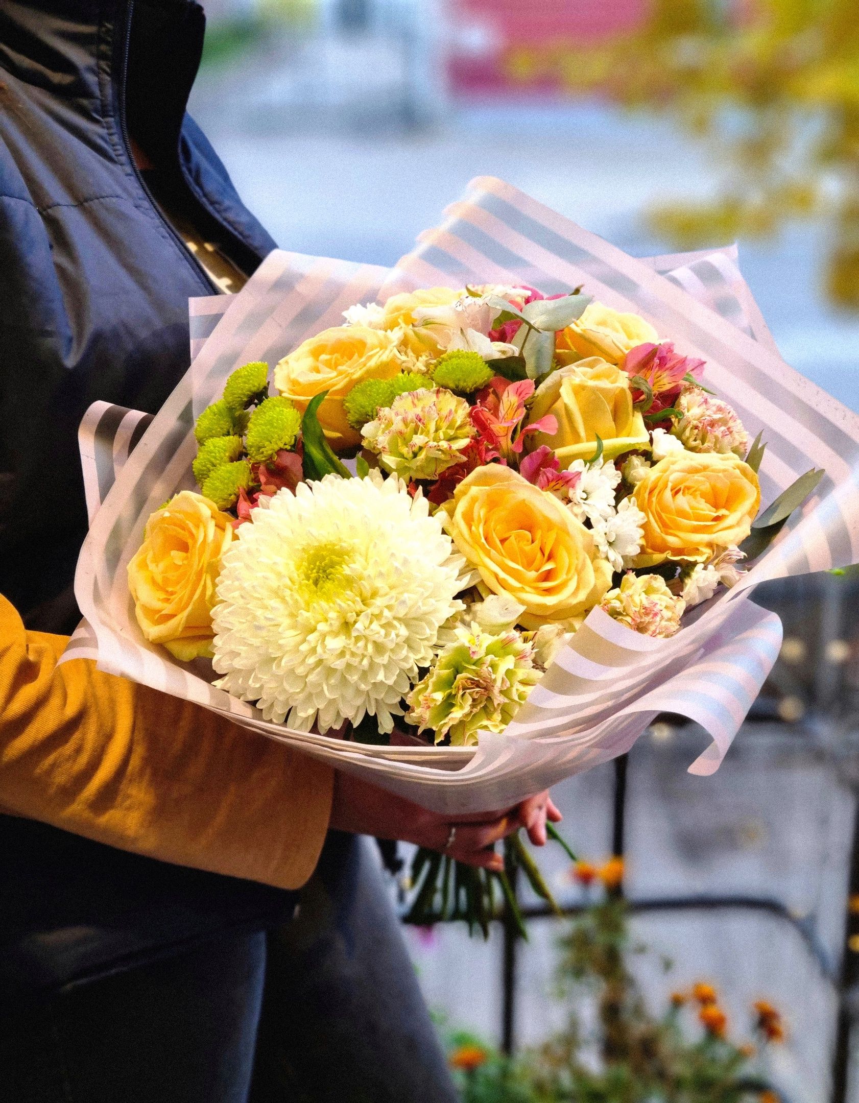 Букет из: одноголовой хризантемы, гвоздики, роз, кустовой хризантемы, сантини, альстромерии.