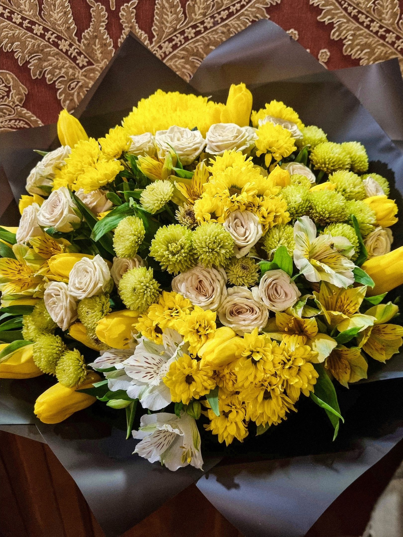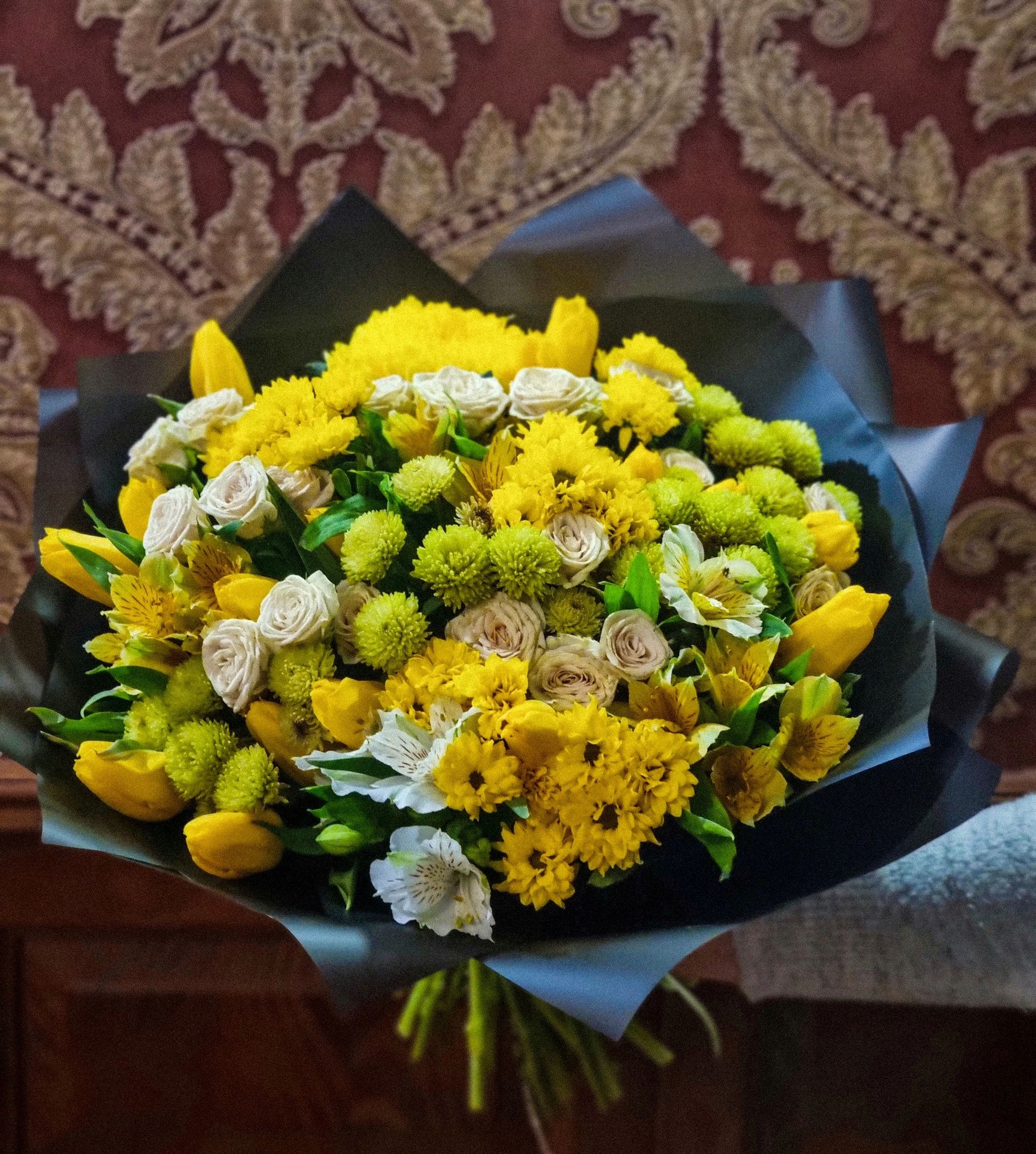 Букет из: сантини, кустовой хризантемы, кустовой розы, тюльпанов, альстромерии.
