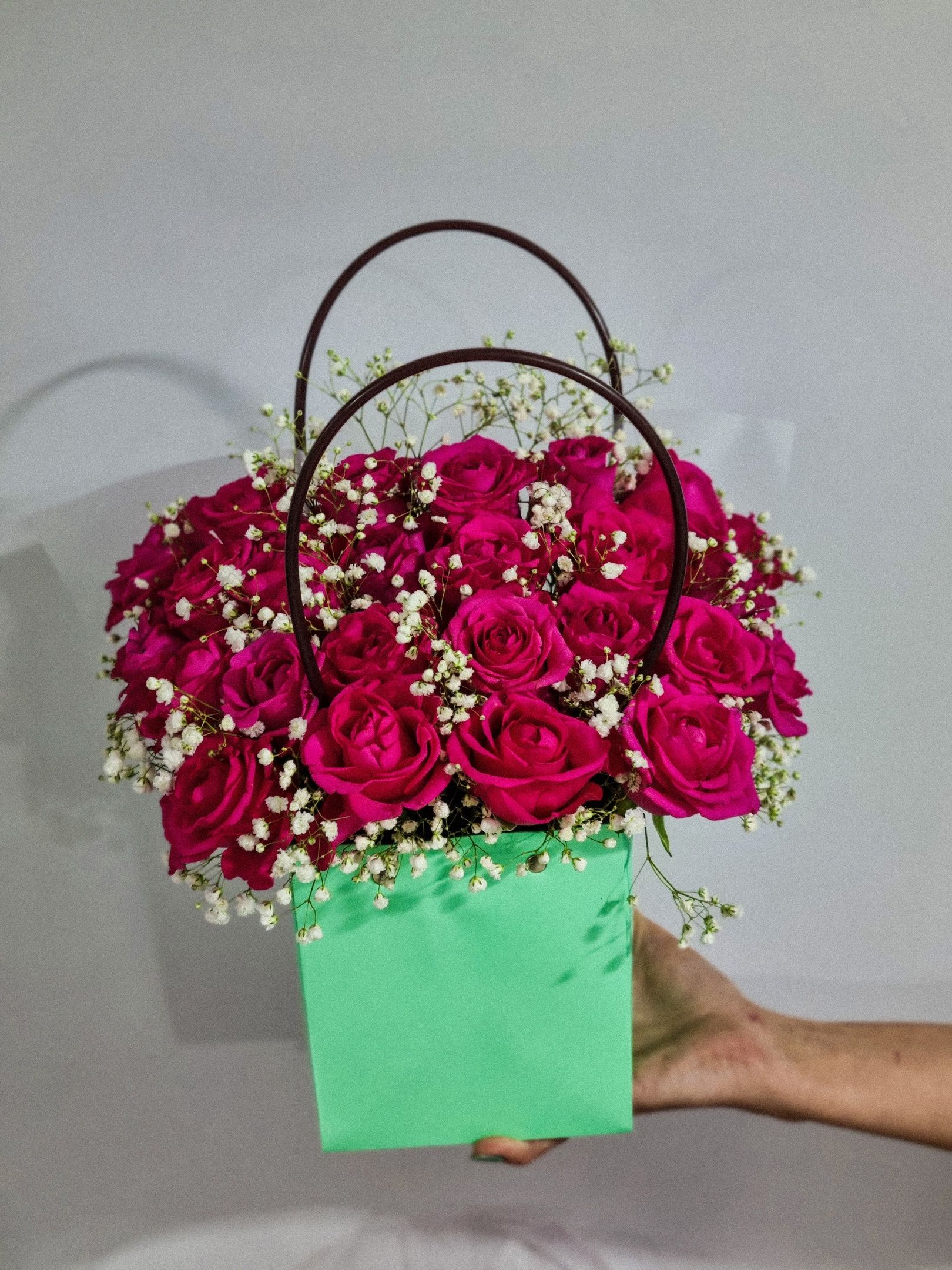 Композиция из роз и гипсофилы.