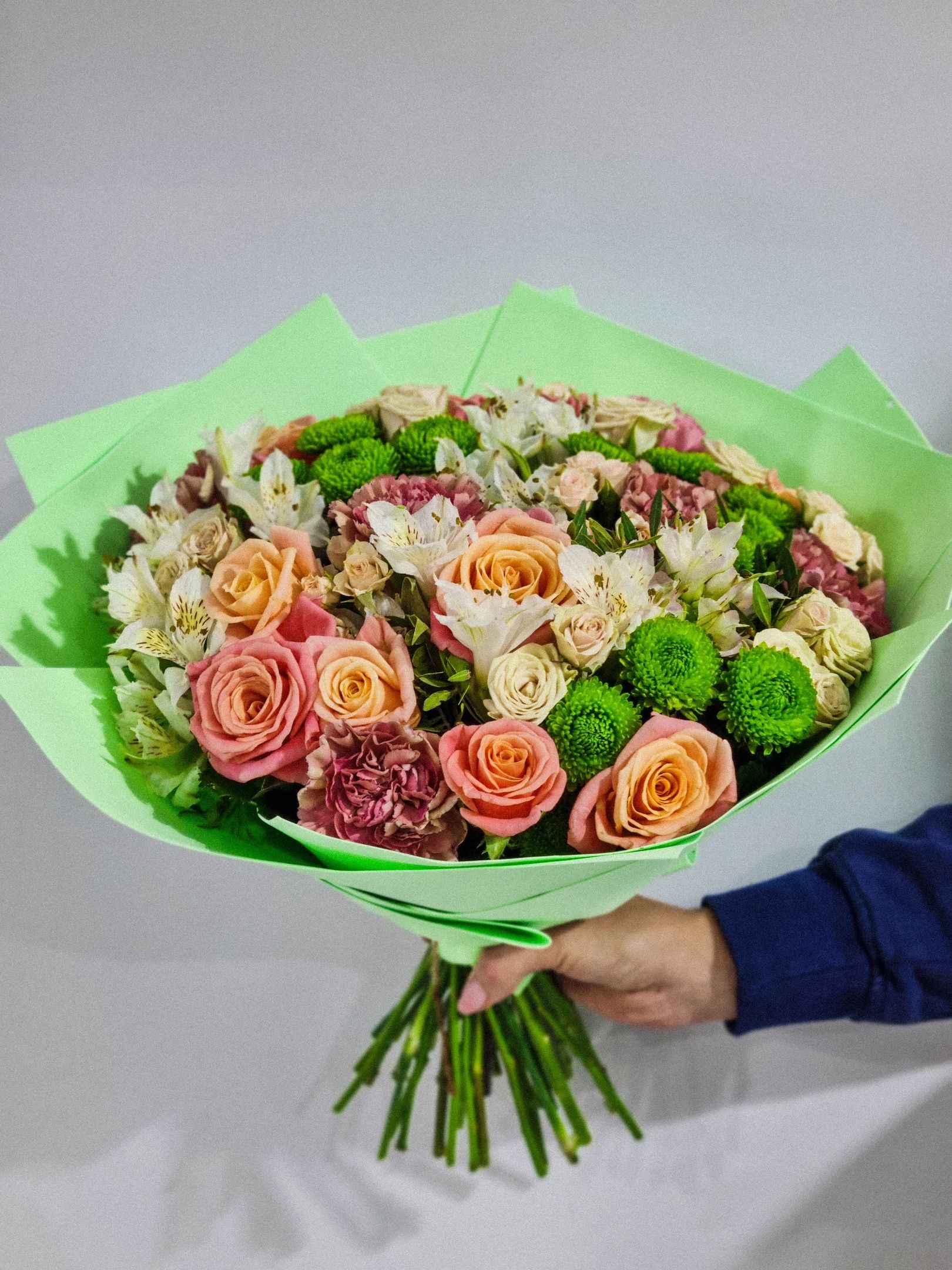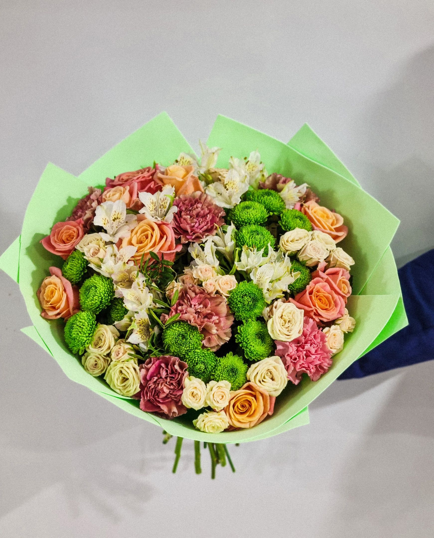 Букет из: альстромерии, роз, кустовой хризантемы, гвоздики, кустовой розы.