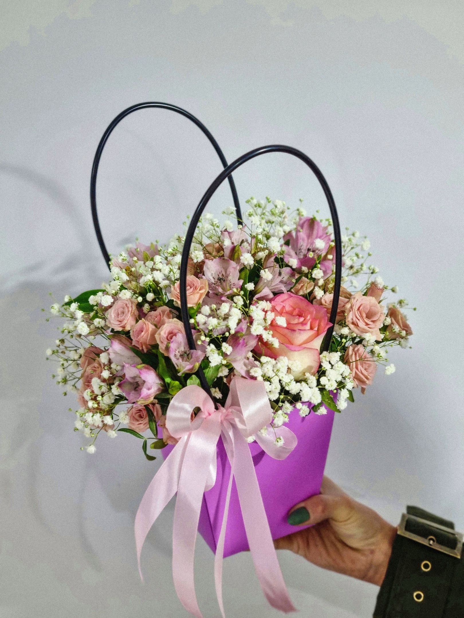 Композиция из: кустовой розы, гипсофилы, роз, альстромерии.