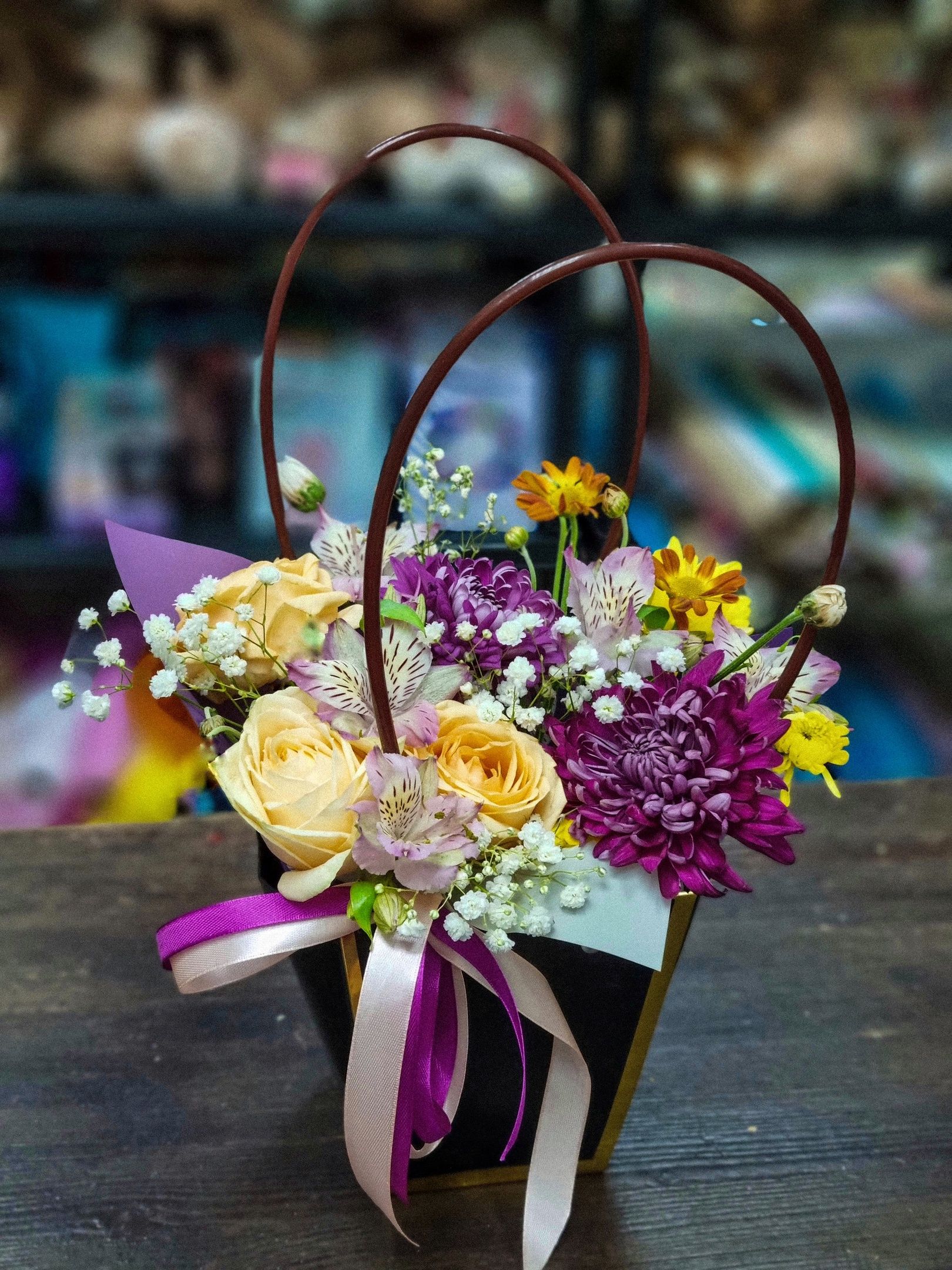 Композиция из: роз, альстромерии, гипсофилы, одноголовой хризантемы, кустовой хризантемы.